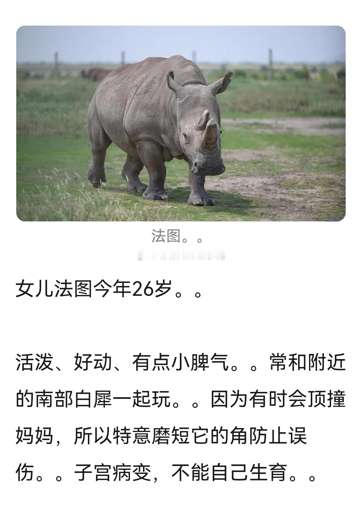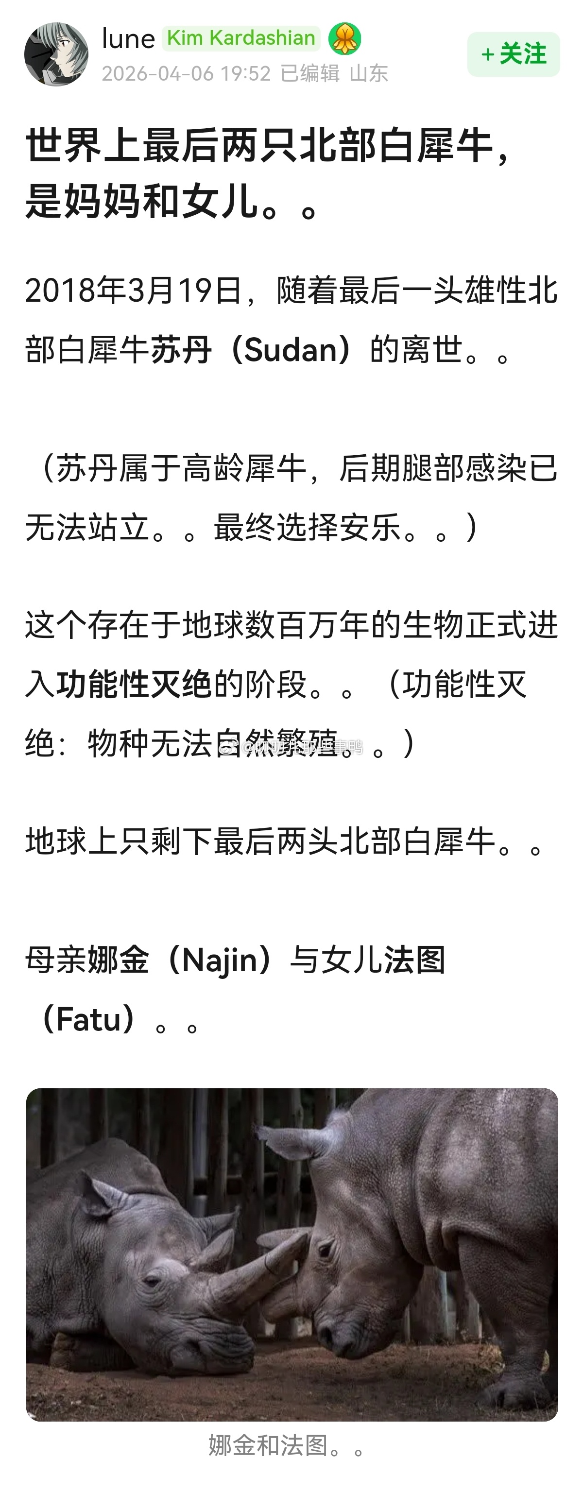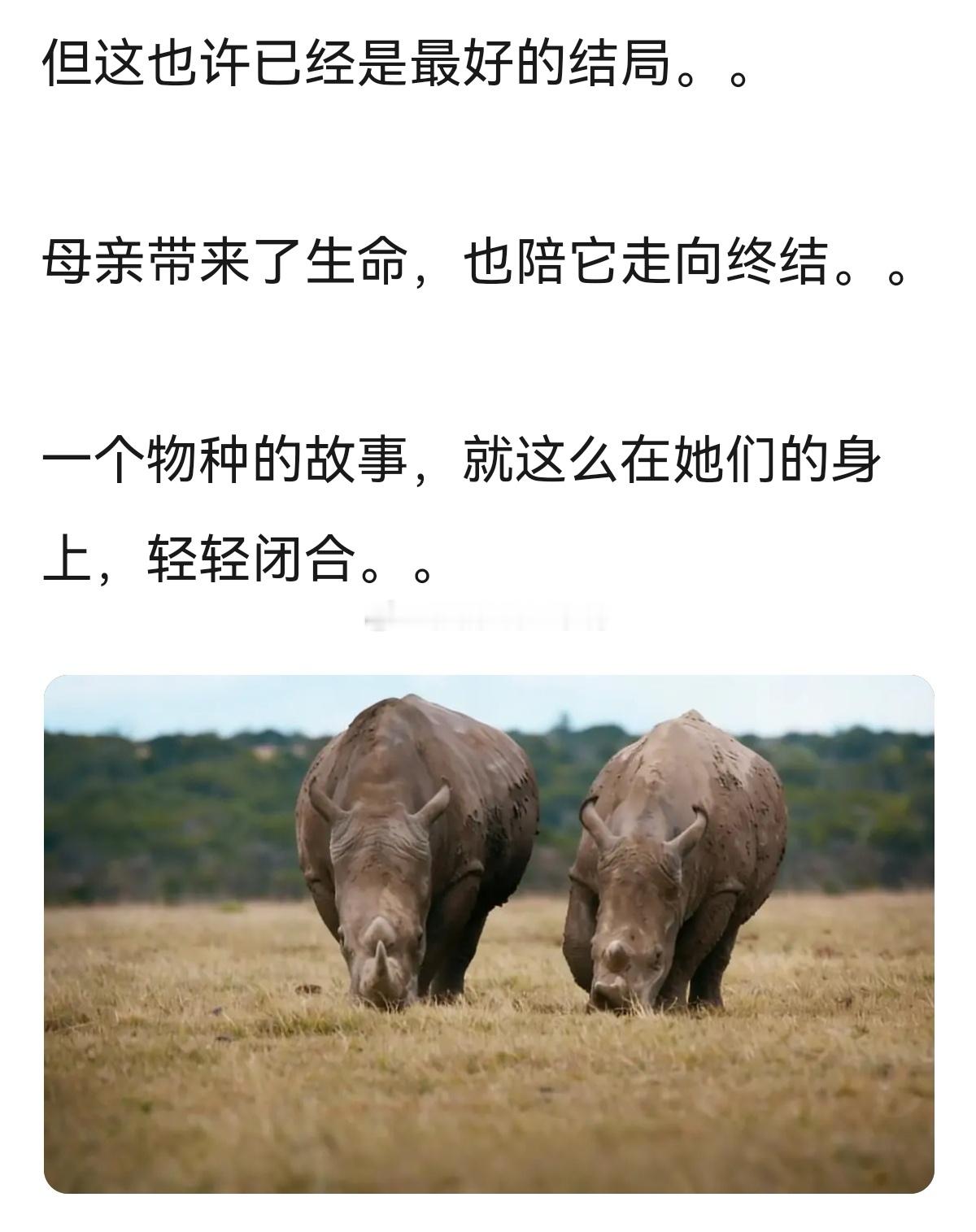 世界上最后两只北部白犀牛,是妈妈和女儿,和妈妈一起走完犀牛生,也是很幸福的结局~