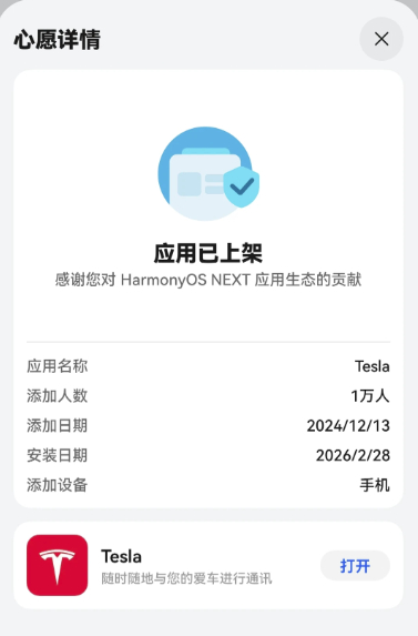 特斯拉鸿蒙版App来了!正式上架华为应用市场,支持远程车控、手机钥匙、温度控制等