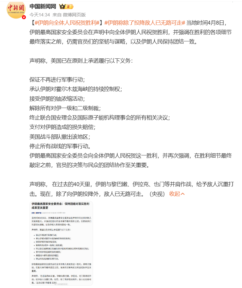 🔻这个伊朗10条看一次笑一次。🔻不管美国最终签不签,同意以这10条为谈判基础也够丢人的了。伊朗向全体人民祝贺胜利以色列电视台倒计时轰炸等来停火海外新鲜事中东现场直击