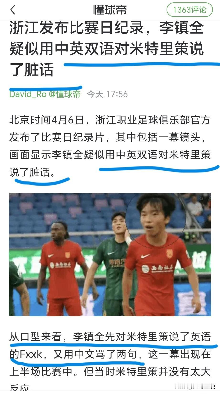 因为在浙江队官方发布的比赛日视频中,清晰拍到了李镇全用中英文双语问候米特里策及其家人,这个镜头也成为认定李镇全辱骂对手的关键证据之一[恐惧]