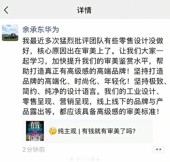 现在的华为和鸿蒙智行,无论是工业设计还是品牌势头,在很多人眼里已经是“9分颜”的优等生了。但老余偏偏要在朋友圈公开“撕”自家团队。