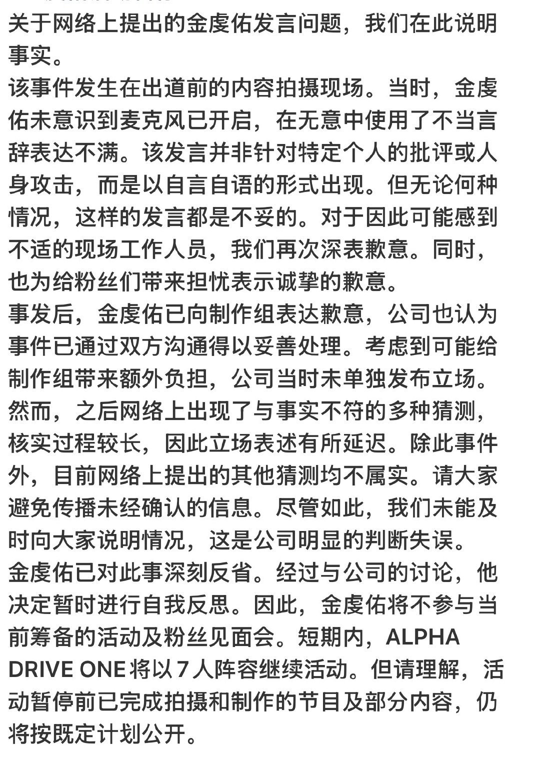 网传金虔佑存在霸凌工作人员的相关争议,引发网友热议与关注。其所属公司正式发布官方声明,宣布金虔佑即日起暂停演艺活动,后续将配合内部调查处理。与此同时,金虔佑本人也公开手写道歉信,就此次争议事件进行道歉,表达自身反省态度。