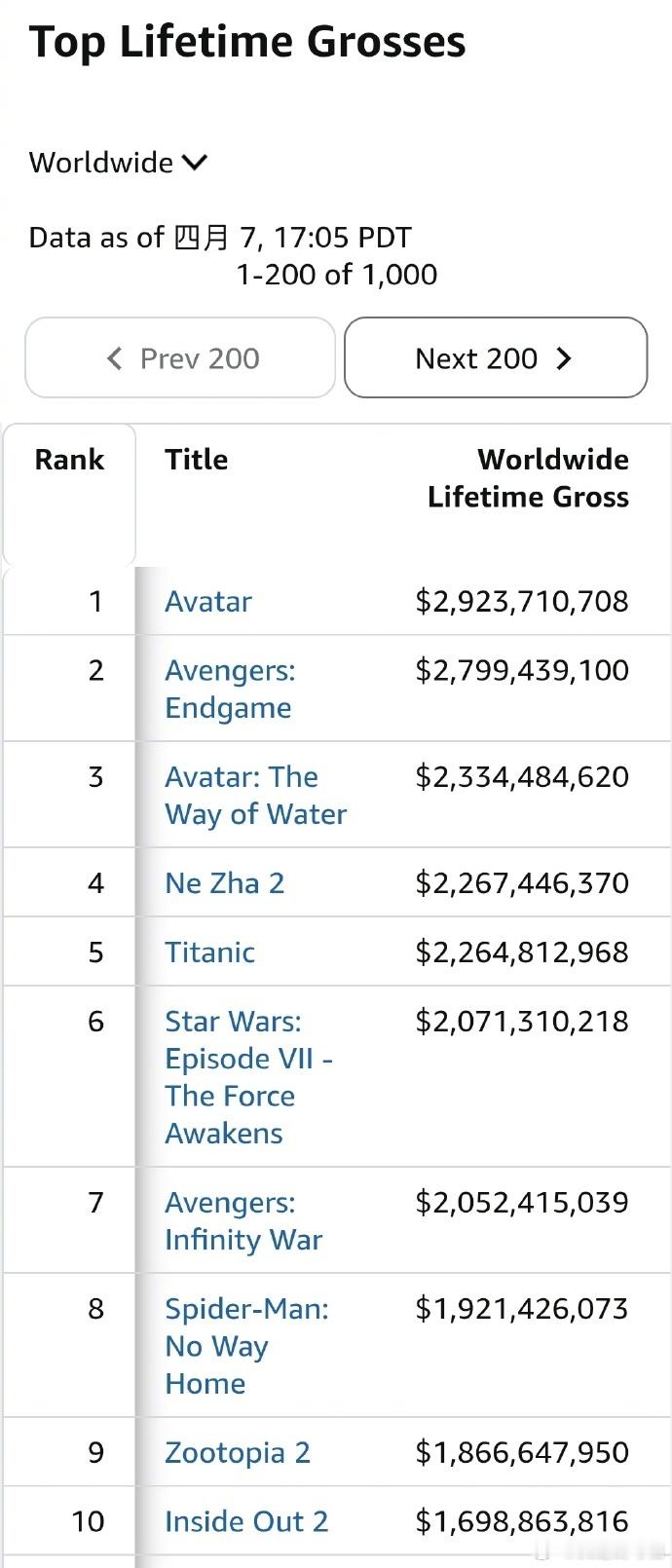 《哪吒2》以22.67亿美元票房超越《泰坦尼克号》,升至全球影史第四!前五梯队更新:1.《阿凡达》29.23亿2.《复联4》27.99亿3.《阿凡达2》23.34亿4.《哪吒2》22.67亿5.《泰坦尼克号》22.64亿