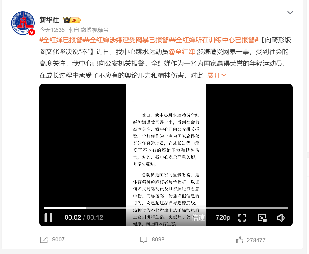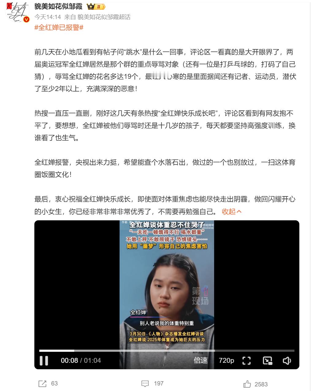 全红婵已报警 这个事情越闹越大了,前2天看到说是有个群里面都在放任骂全红禅,而且很多跳水和体育行业的同行,这个事情要严查,要保护好我们的国家运动员。她出身贫困人家,能通过自己的努力逆袭,13岁就为国争光已经非常好了,即便以后她没有拿金牌,她也是做过巨大贡献的运动员,而且拿的不止一个金牌。就好像刘翔,2008年众望所归的时候受伤了,但是他2004年雅典奥运会的记录还在那,20多年了,无人能破。