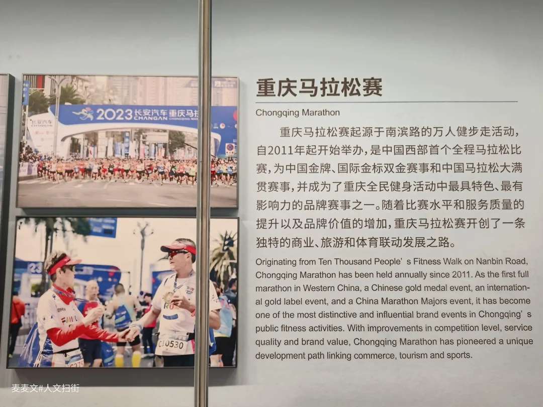 而在品牌赛事与全民健身板块,我看到了体育精神在民间的延续。2011年起步的重庆马拉松赛,如今已是西部首个全程马拉松金牌赛事,照片里南滨路上万人奔跑的盛况,诠释着“山城马拉松”的独特魅力。龙舟公开赛、户外公开赛的奖杯与证书,则展现着重庆群众体育的活力。