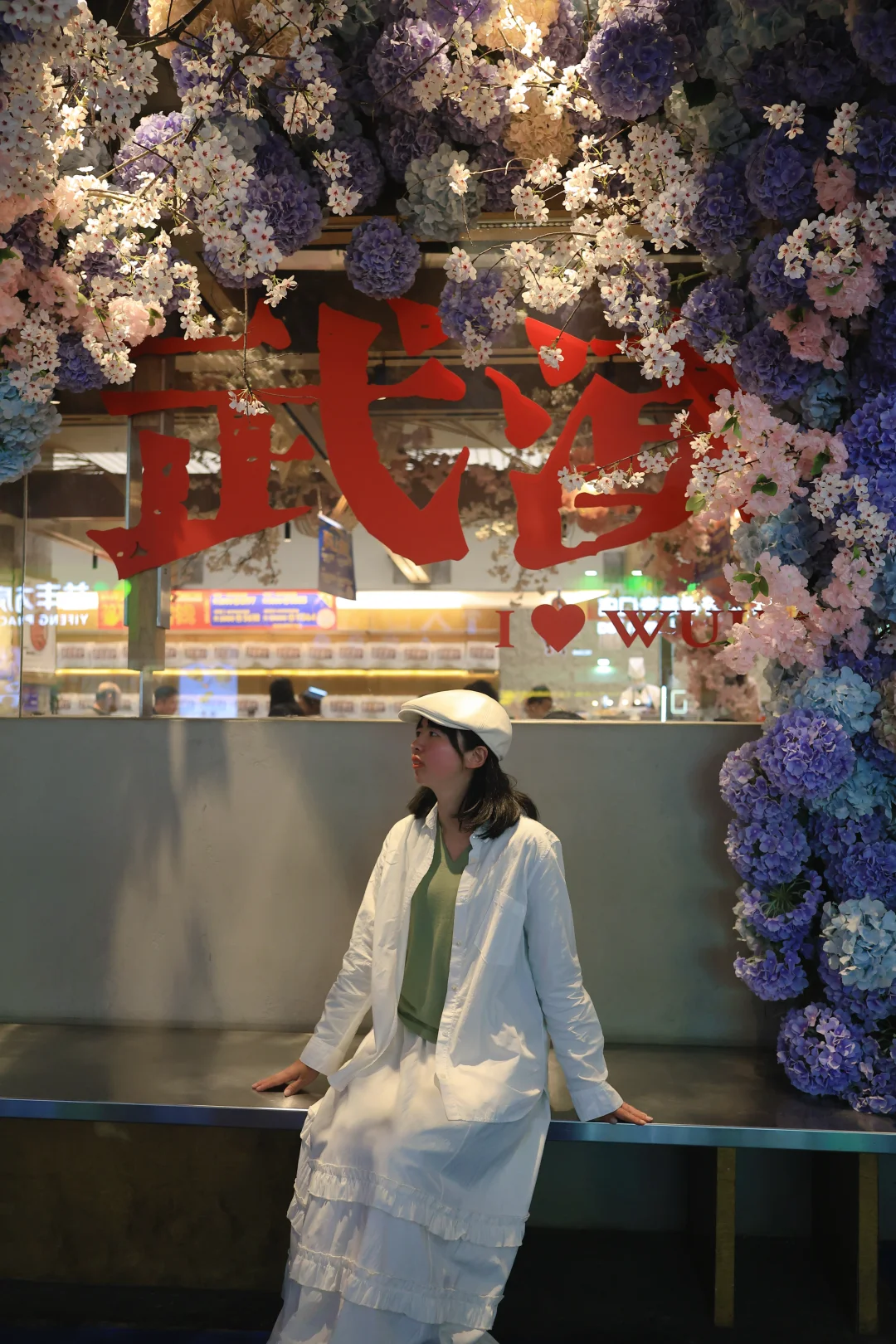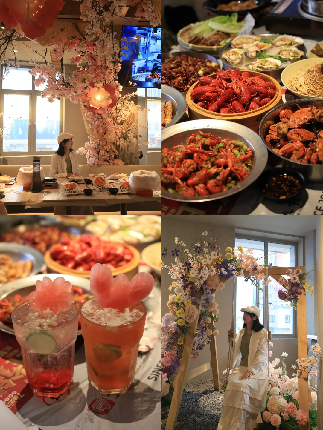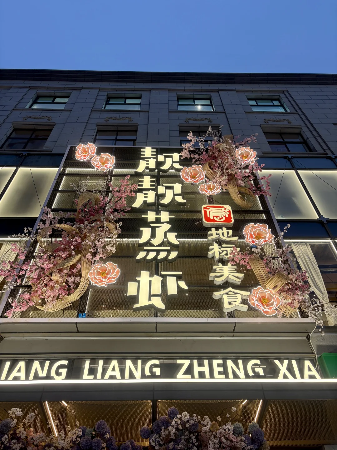 汉口Citywalk结束建议去江汉路的靓靓蒸虾,樱花主题店门头樱花🌸装置好美,夜晚亮灯更有氛围,适合拍照打卡📷