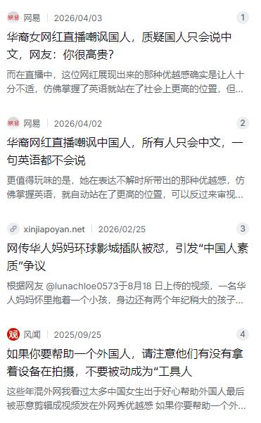 最近网上有个华裔女子的一番话,引发了挺多人的深思。她在视频里聊了一个挺扎心的现象,说西方人之所以老是对中国人指指点点,甚至动不动就瞧不起,原因其实很简单——我们自己对人家太好了。这话乍一听有点让人摸不着头脑,但仔细想想,好像还真有那么几分道理。