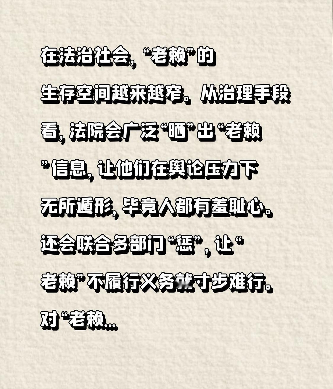 从治理手段看,法院会广泛“晒”出“老赖”信息,让他们在舆论压力下无所遁形,毕竟人都有羞耻心。还会联合多部门“惩”,让“老赖”不履行义务就寸步难行。