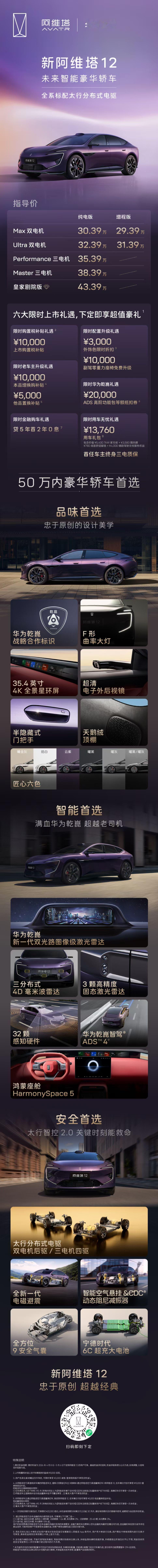 新阿维塔12重新定义时代好车新阿维塔12这次升级,全是用户一眼能感知、一坐就懂的配置🌟智驾硬件拉满全系标配4颗华为激光雷达+乾崑ADS 4.1,城区、高速、泊车全场景高阶智驾标配,不用选装。🌟补能提升到6C纯电配6C超充电池,10分钟就能从30%冲到80%。🌟智控底盘配空悬太行智控底盘+空气悬架,零重力座椅+天鹅绒顶篷+英国之宝音响,豪华感很直观。