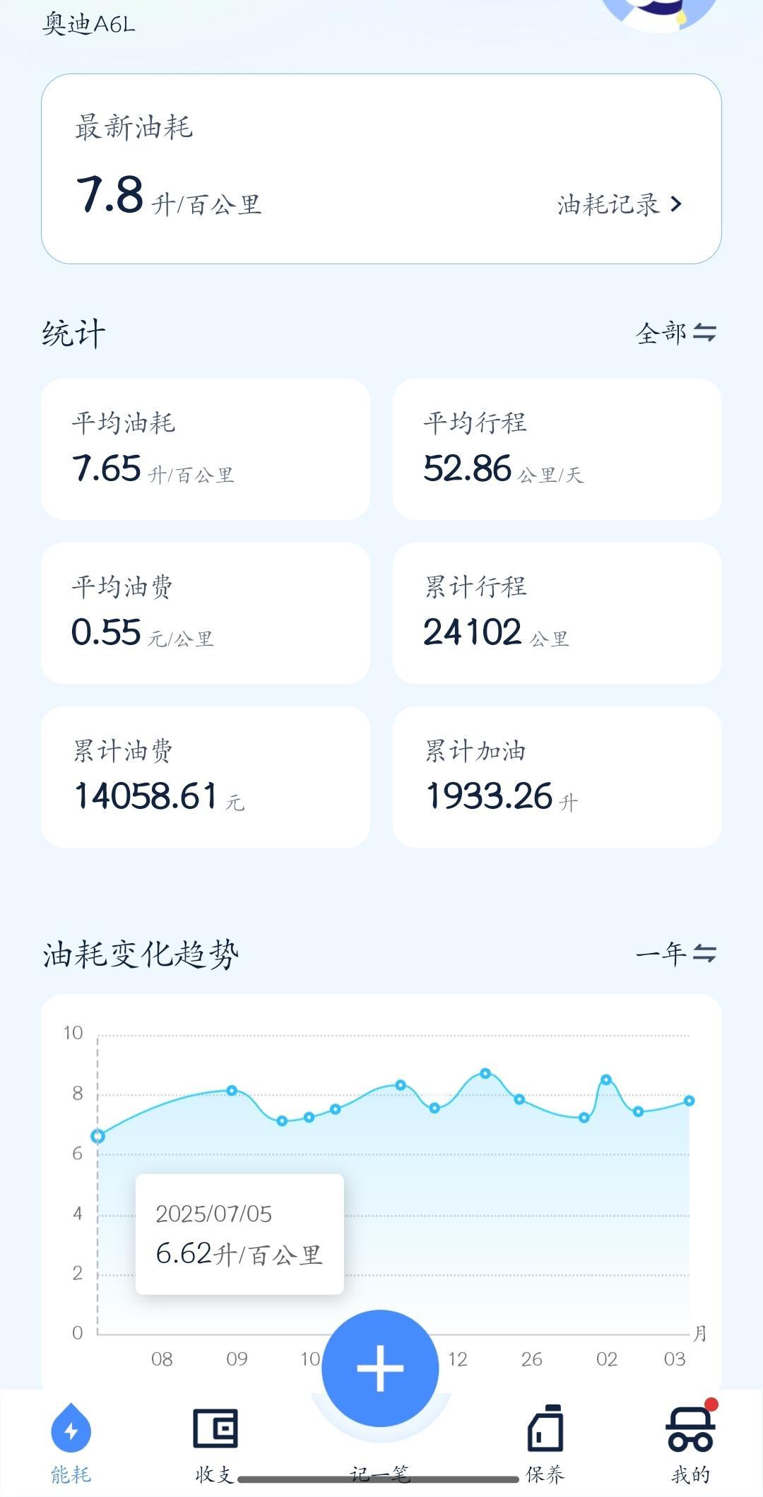 我基本上一年跑个两万公里吧,通过平时的记录,油耗7.5L/100km,基本上出行费用在6毛一公里,整体上还算比较省油的车了,20000×0.6=12000元。