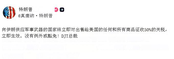 2026年4月8日,特朗普在Truth Social发帖宣布:“任何向伊朗提供军事武器的国家,其销往美国的所有商品将立即被征收50%的关税,即刻生效。绝无例外或豁免!”