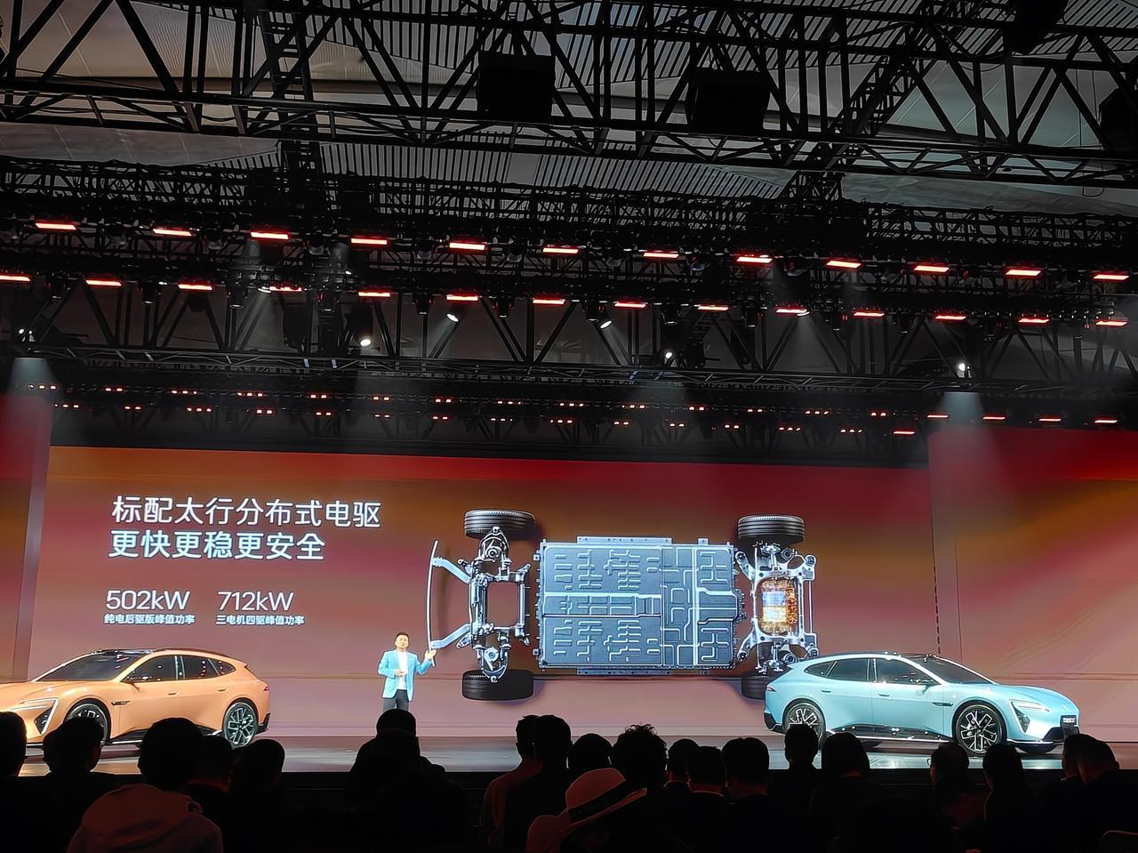 ★ 性能方面,不管是纯电还是增程都标配了宁德时代电池与分布式电驱,新车有0+2的双电机后驱和1+2的三电机四驱,仅后驱就有502kW的功率,百公里加速3.74秒。