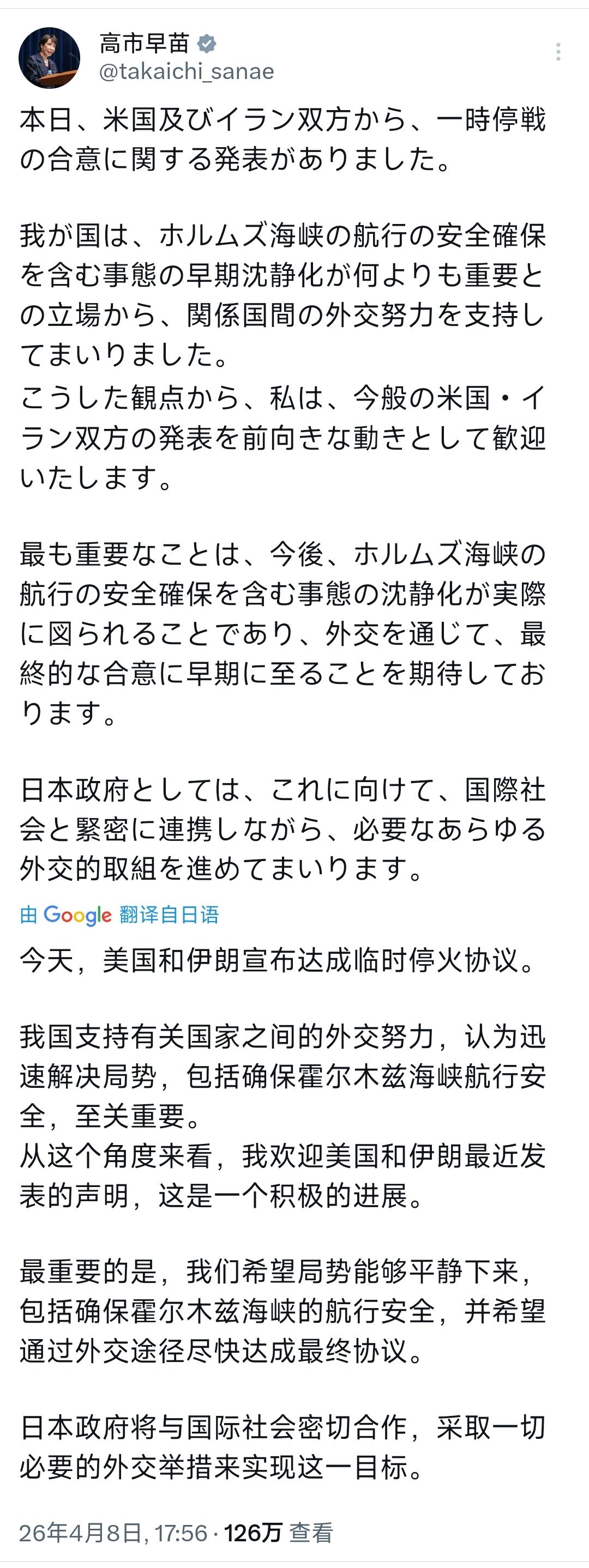 高市早苗今晚(4月8日晚)发文写道:“今天,美国和伊朗双方均宣布了关于暂时停战的