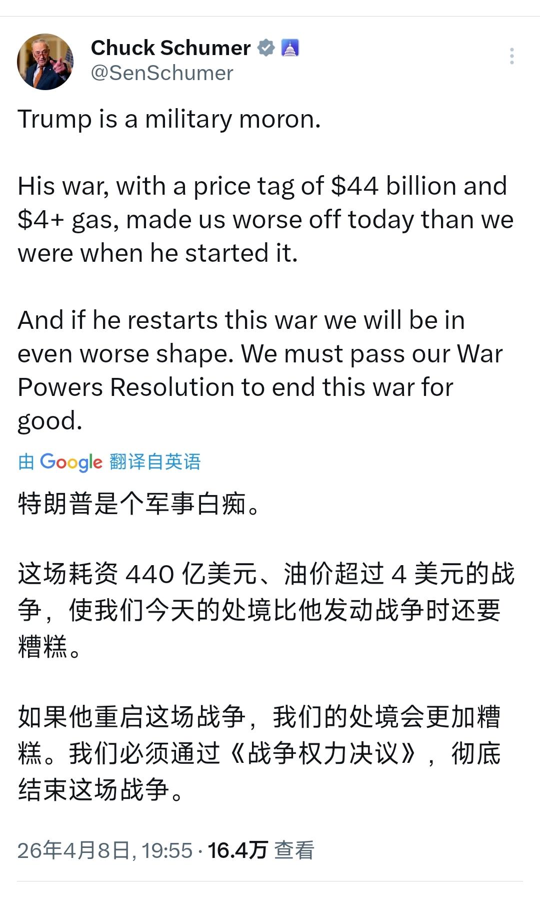 [机智]评几句:查克·舒默说错了吗?并没有!美国在历时38天的非法战争中获得了什么?不过是440亿美元打了水漂,油价冲破4美元大关,国内通胀高烧不退,中小企业被燃油附加费逼入绝境,民众购买力持续缩水。特朗普口中的“压倒性胜利”,终究是自欺欺人的谎言,这场毫无正当性的战争,只换来地区局势更动荡、美国国际信誉再崩塌,连盟友都避之不及。所谓军事行动不过是霸权主义的无脑豪赌,特朗普的刚愎自用,让美国深陷经济与战略的双重泥潭,舒默的怒斥,不过是戳破了这场荒唐战争的遮羞布,而美国若不叫停霸权行径,只会在自我毁灭的道路上越走越远。