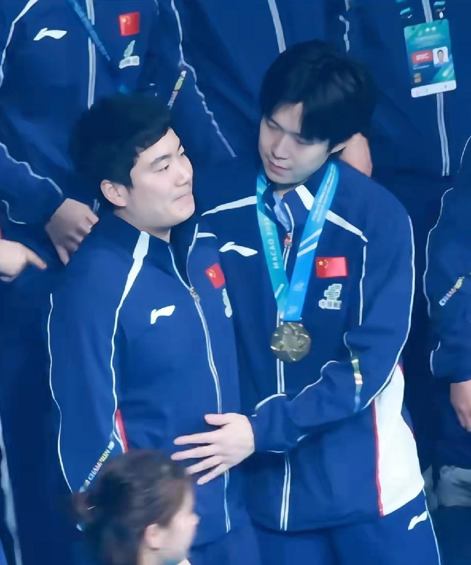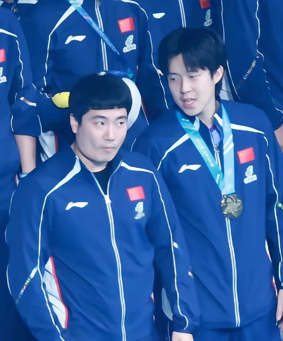 国乒大合影甜甜哥大头站在一起。