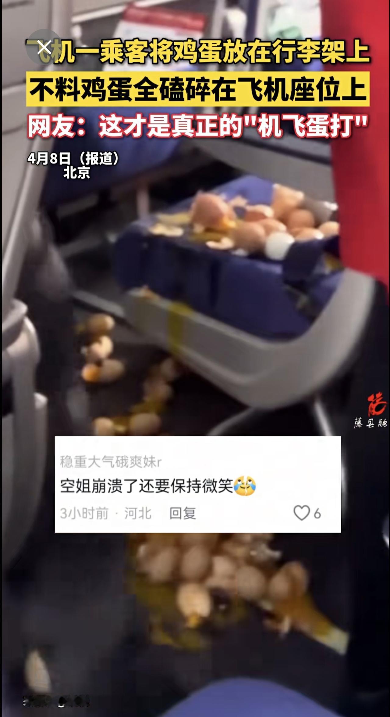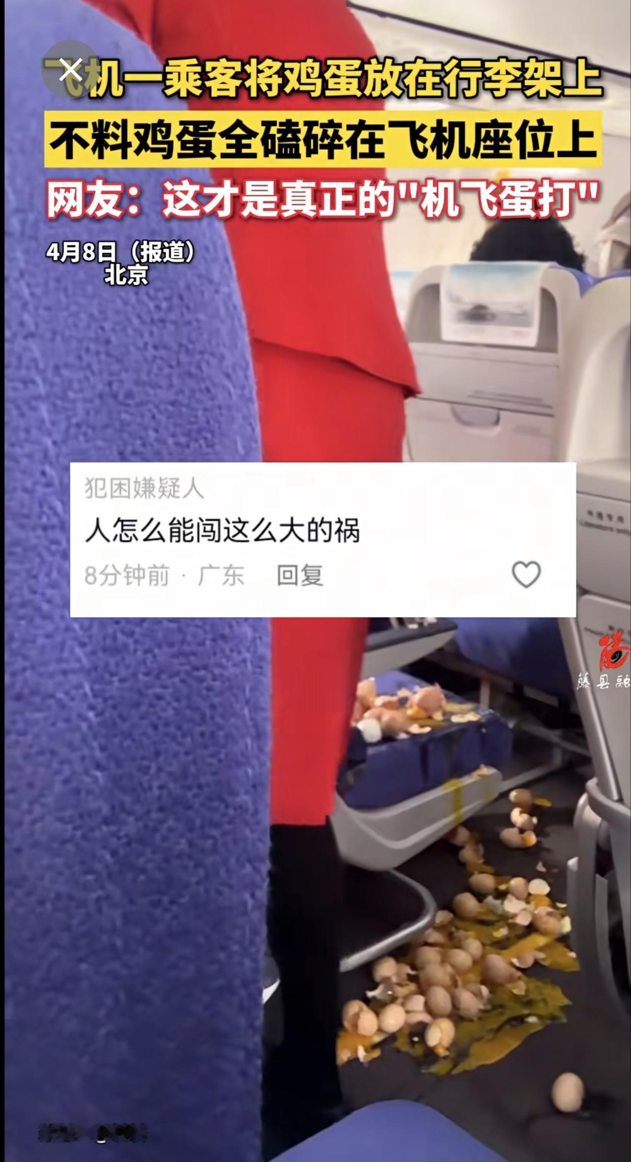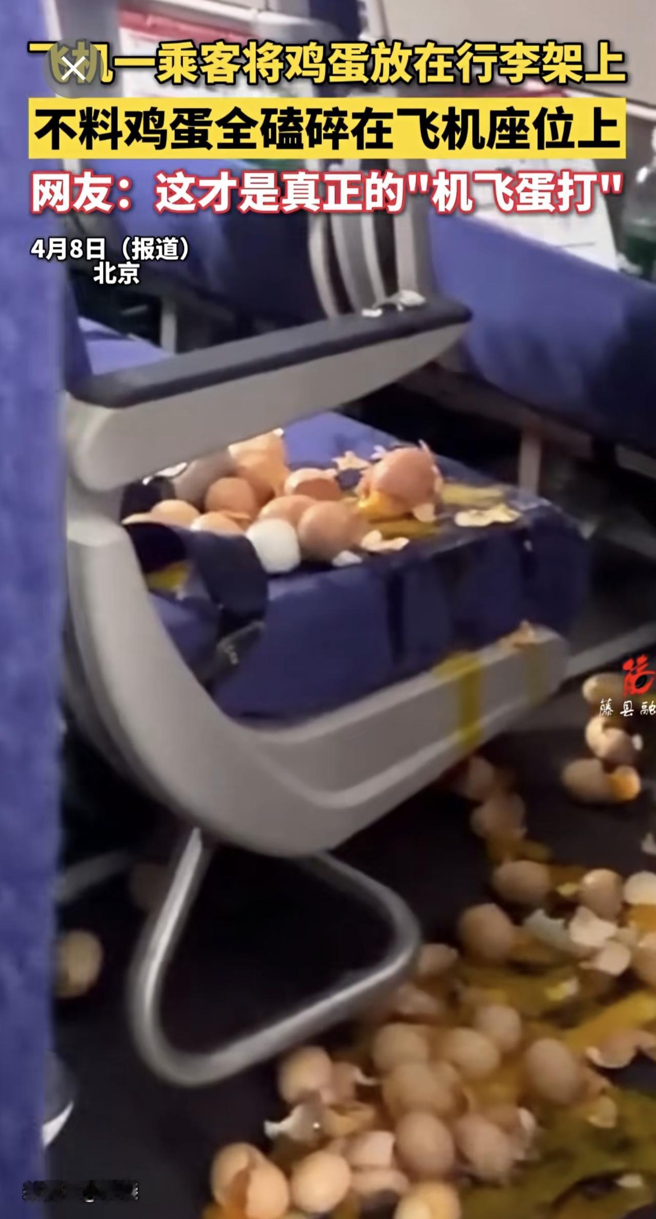 飞机一乘客将鸡蛋放在行李架上,不料鸡蛋全磕碎在飞机座位上,网友:这才是真正的"机