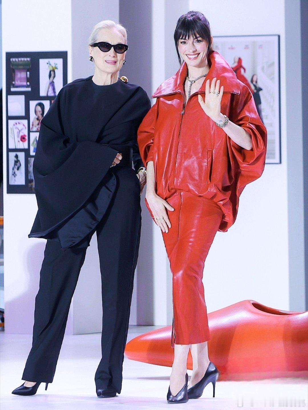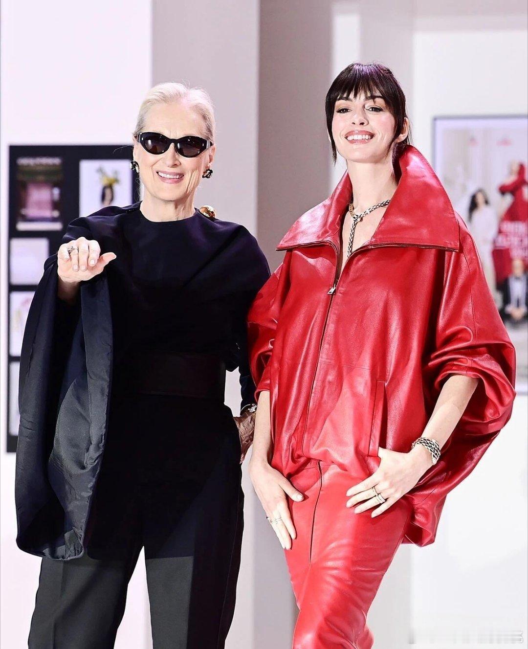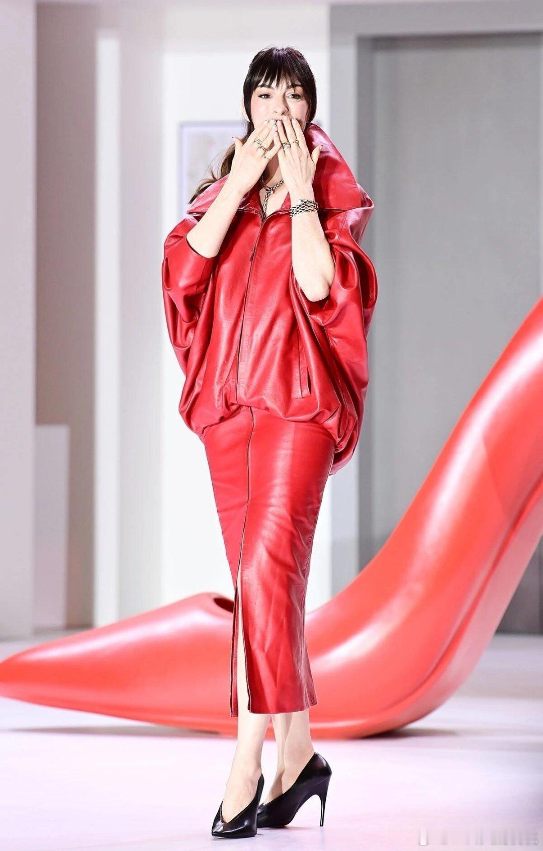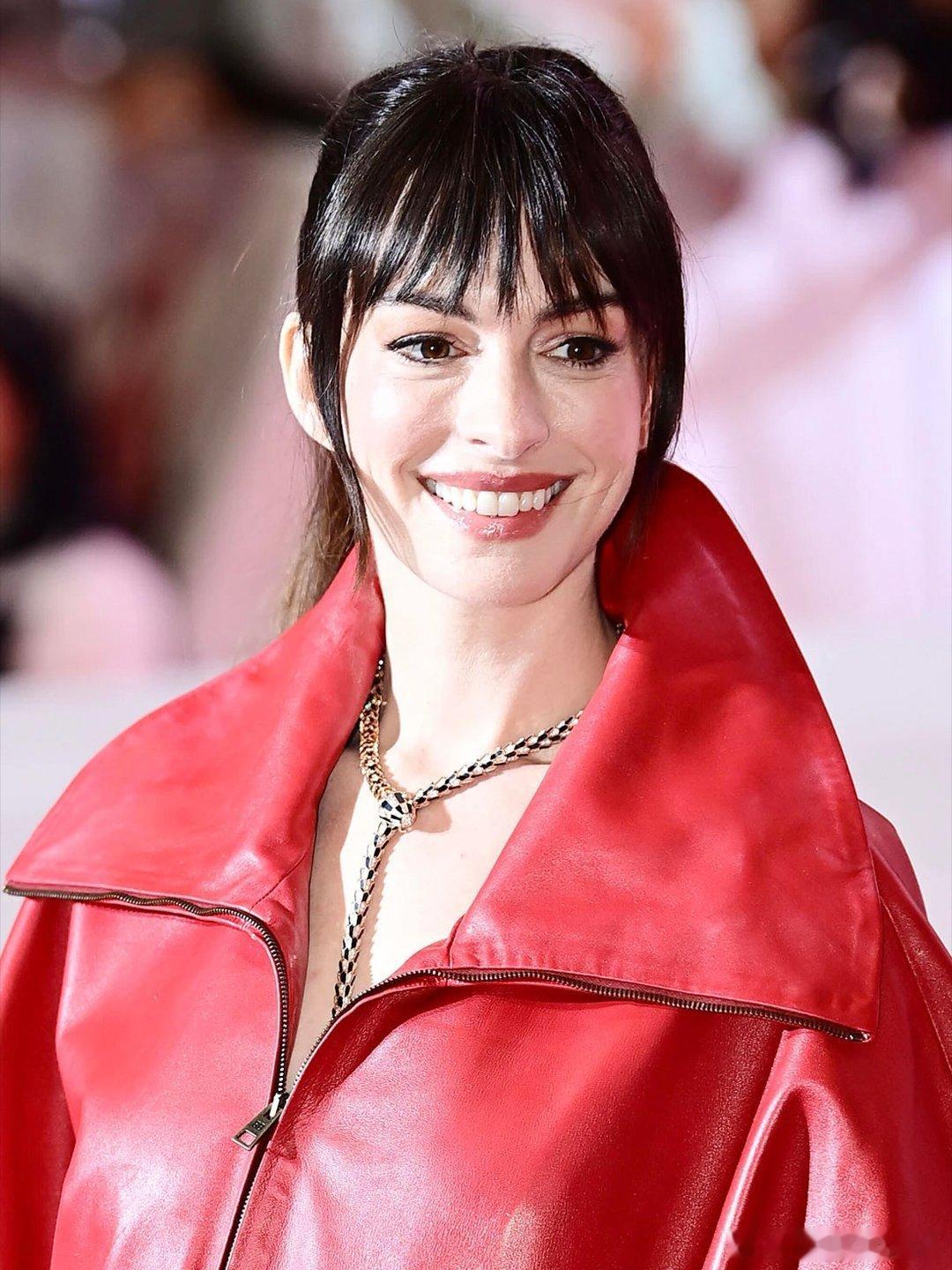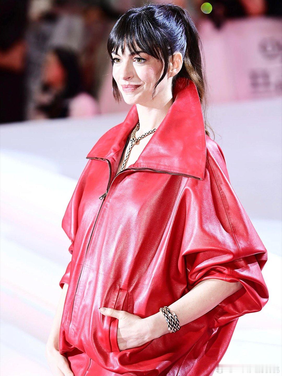 安妮海瑟薇亮相《穿普拉达女王2》首尔主创见面会,上身Balenciaga 2026冬季系列红色皮裙造型,气场全开!时尚头排客