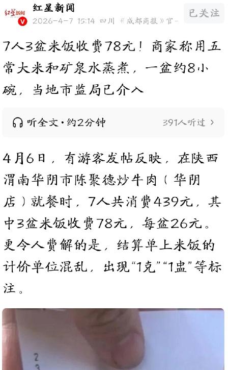 说白了,华山脚下这事简直离谱到没边儿!7个游客爬完华山饿到前胸贴后背,去餐馆吃顿饭,三盆米饭竟然被收78元,合着一盆就要26元,比不少地方的荤菜都贵,这到底是米饭镶了金,还是店家在玩文字游戏宰客?