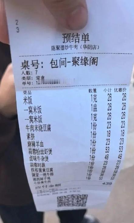 事情发生在陕西渭南华阴市,就是华山脚下的餐馆,7名游客爬完华山浑身乏力,饿坏了就找了家餐馆落脚,想着多吃点米饭垫垫肚子,就点了三盆米饭,再加上一些菜,一顿饭下来总消费439元。