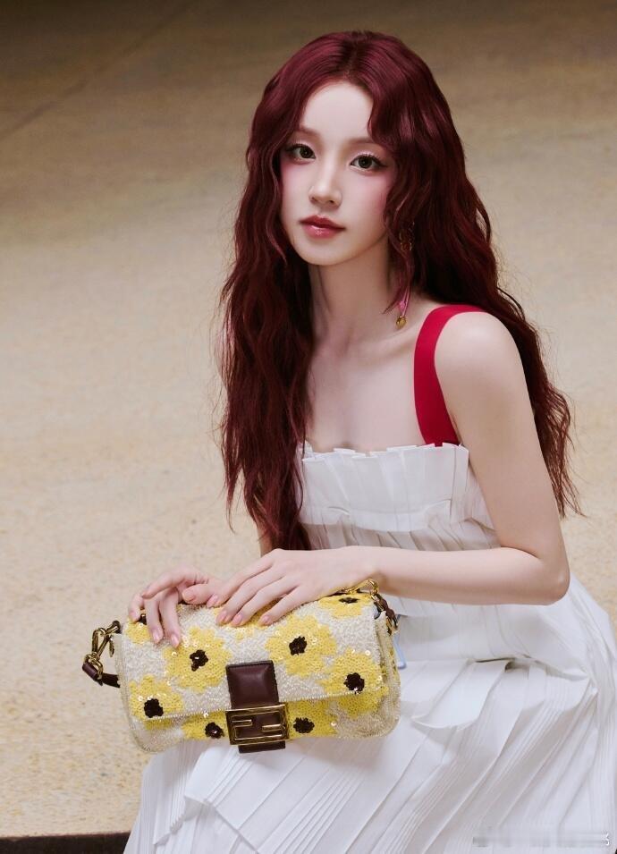 酒红色卷发,白红撞色百褶吊带裙勾勒灵动身姿,FENDI 2026春夏系列黄色花卉法棍包点睛造型,将意式复古与少女活力完美相融。