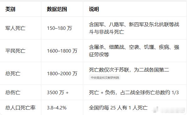 千分之四至千分之六(古代子女比较多)。知道我们为什么那么恨日本吗?二战期间,日本造成中国3500万人伤亡,死亡率和伤亡率分别占总人口的3.75%和7.3%——这就意味着那时的每户人家都有亲人或亲戚因小鬼子而死伤,你说能不恨日本人吗?反正,我永远忘记不了对日本的仇恨——我外公就是被小鬼子打伤后退伍下来的。上面还是算大帐的,如果算细账,那就更恐怖了。