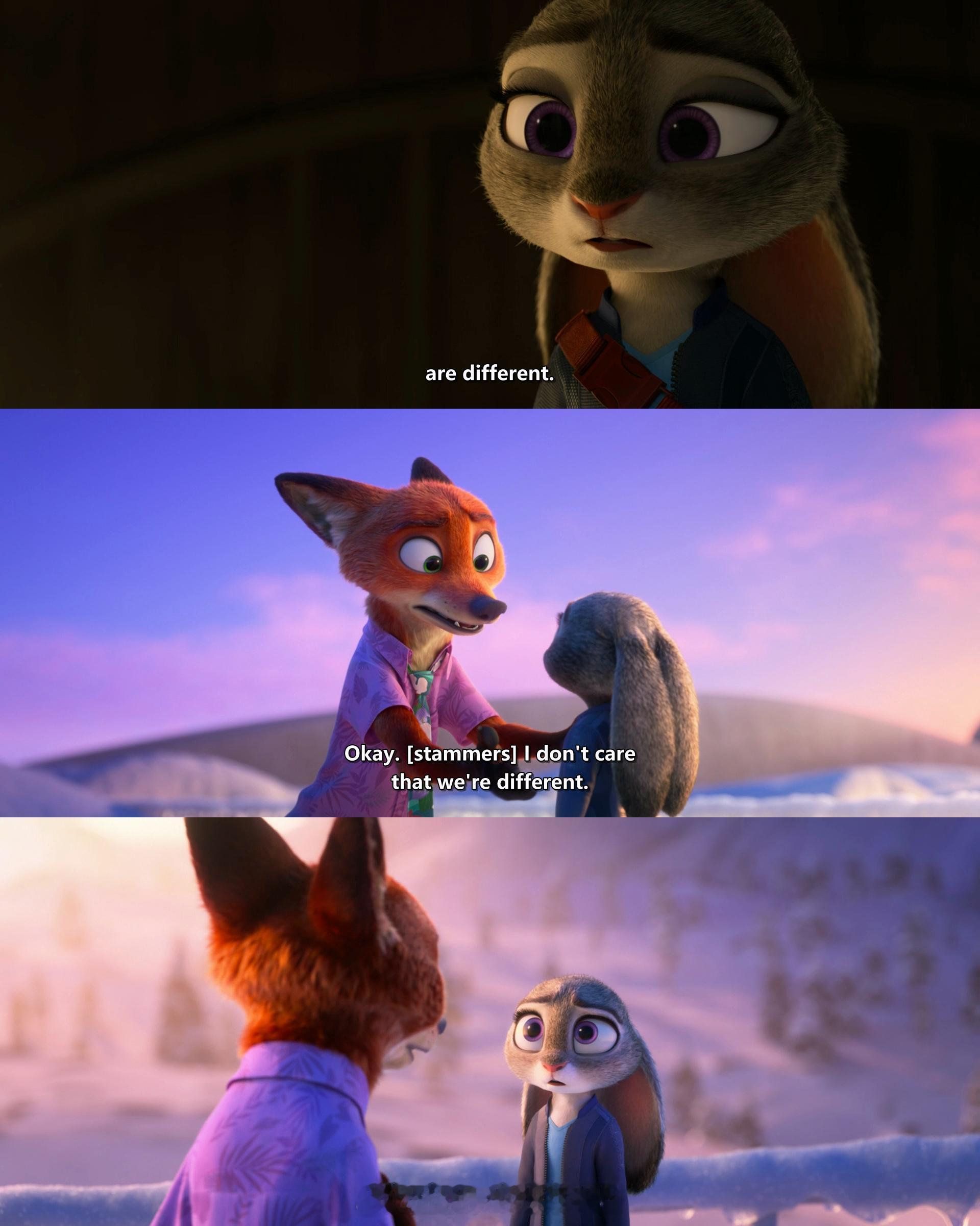 这就恰好解释了,朱迪后面为什么会直白说出「我们太过不同,不该再做搭档」的话。朱迪并非突然想到两人的不同,而是早就陷入了对「差异」的执念,因此只能选择分开。不过影片结尾尼克的台词很棒,他不在意两个人物种、性格与身份的不同,他在意的只是自己的搭档朱迪。