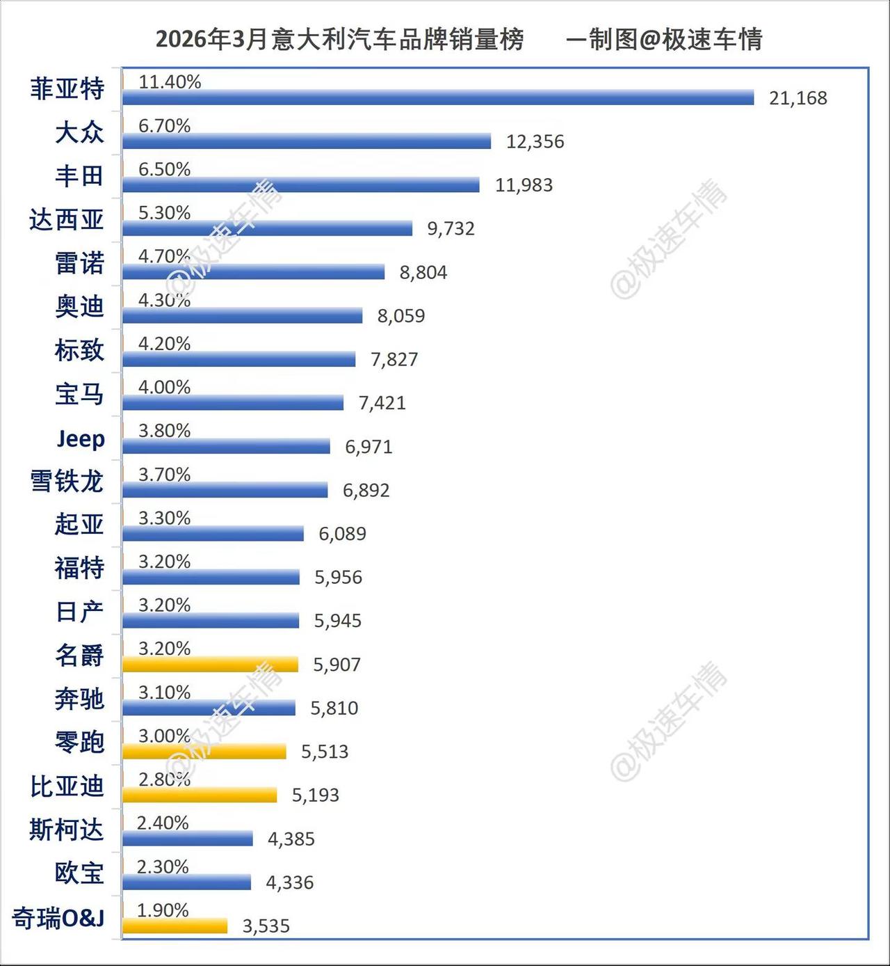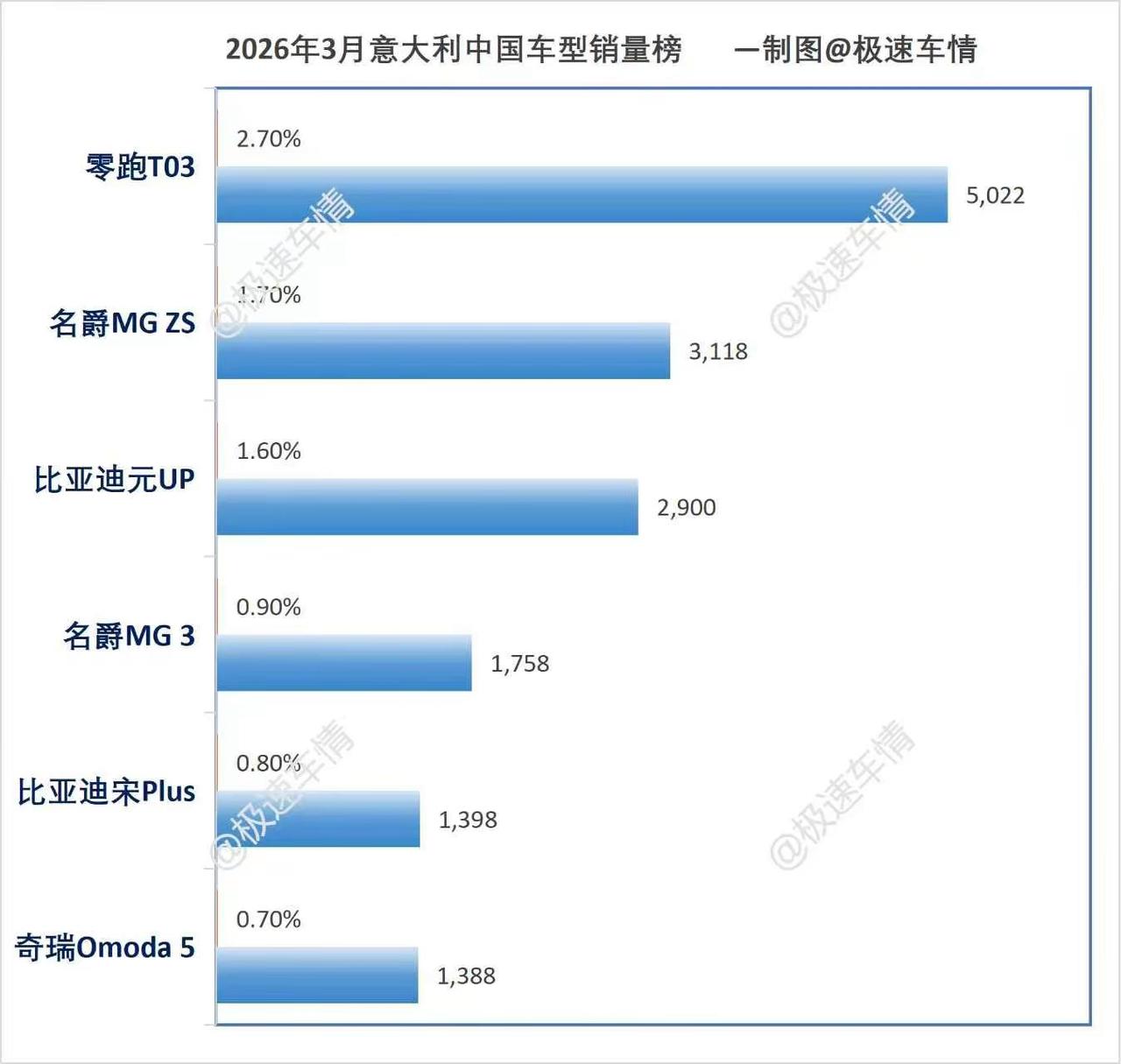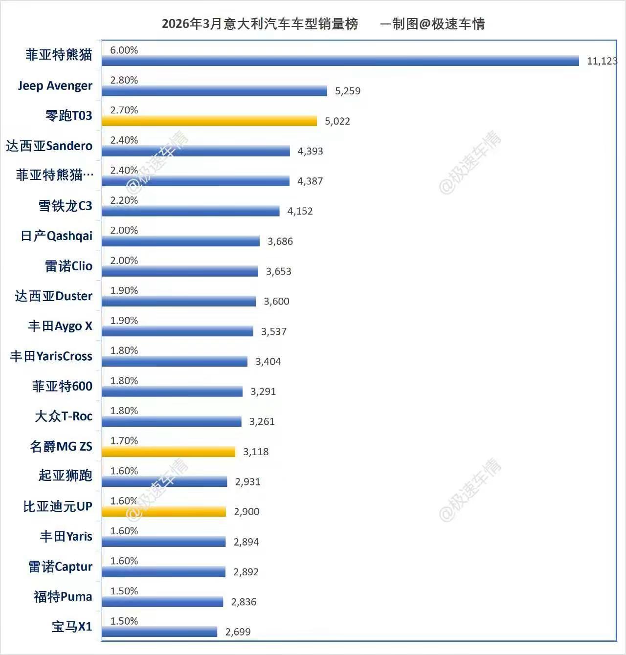 意大利2026年3月汽车销量排行榜!意大利3月,零跑暴涨2727.2%,比亚迪大