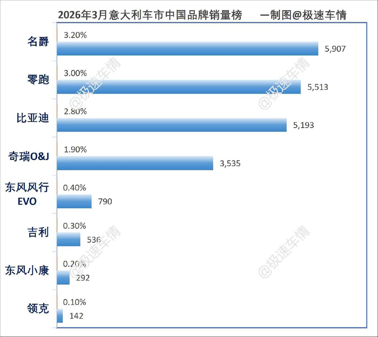 意大利2026年3月汽车销量排行榜!意大利3月,零跑暴涨2727.2%,比亚迪大涨190.6%,奇瑞Omoda&Jaecoo大涨258.2%极速车情 意大利 零跑 米兰