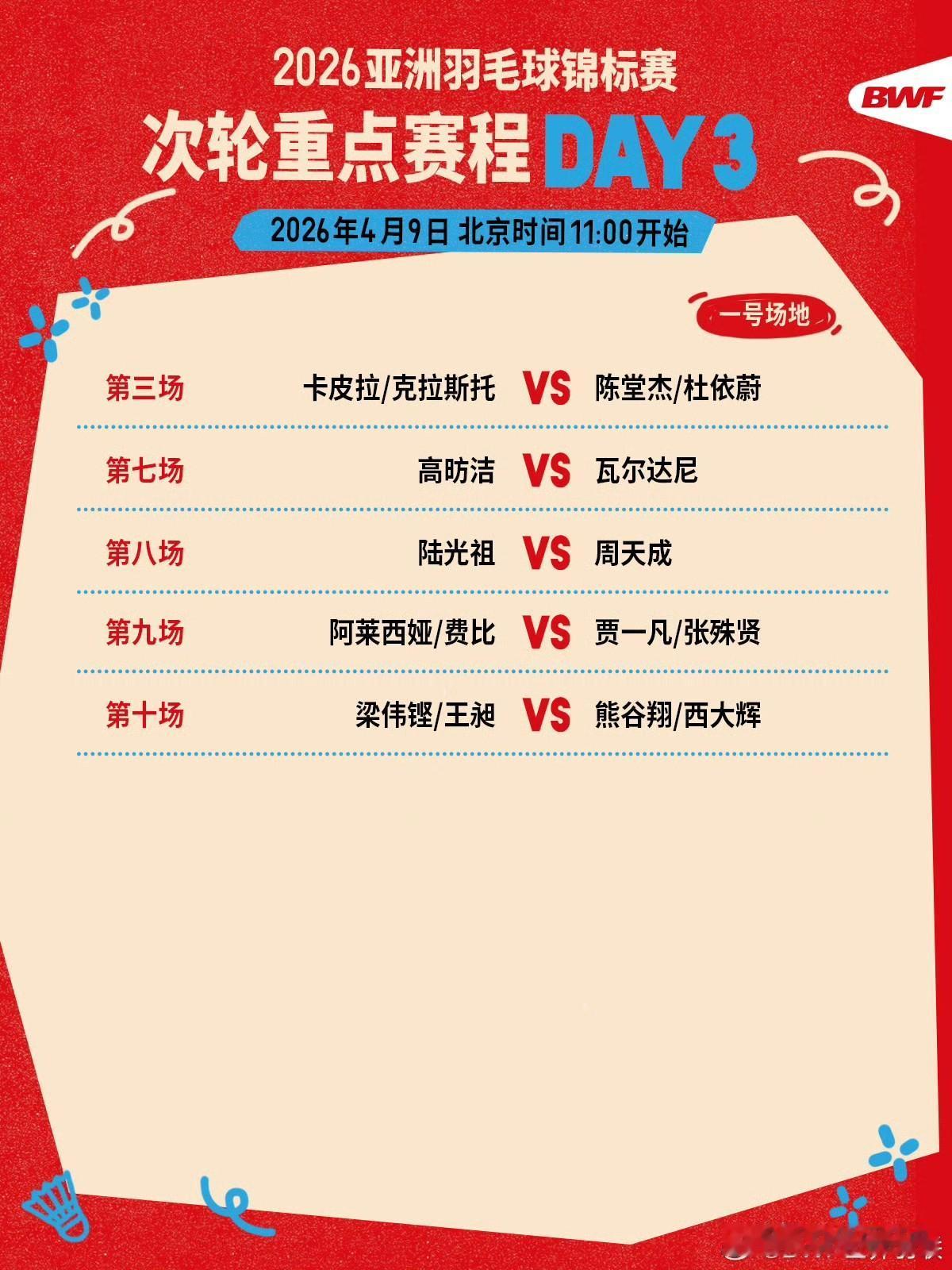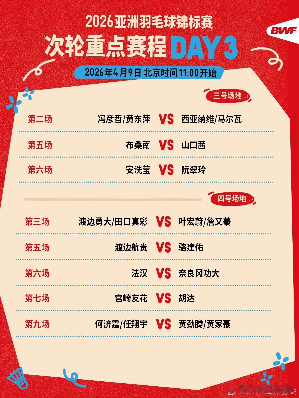 2026亚洲羽毛球锦标赛(超级1000)4月9日11:00进入第三比赛日,国羽在男单、女单、双打全线出击,多场硬仗值得关注。