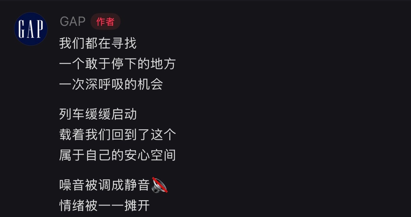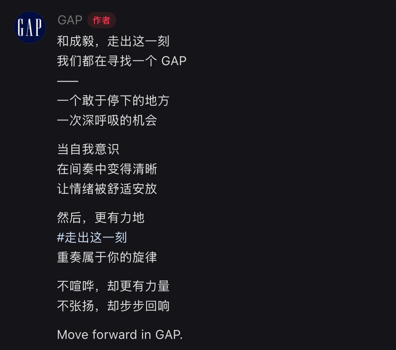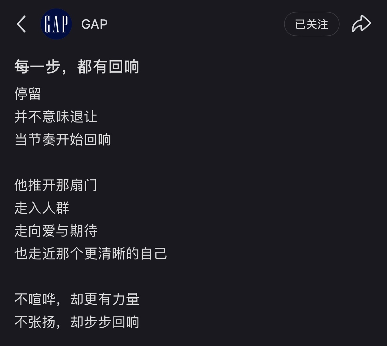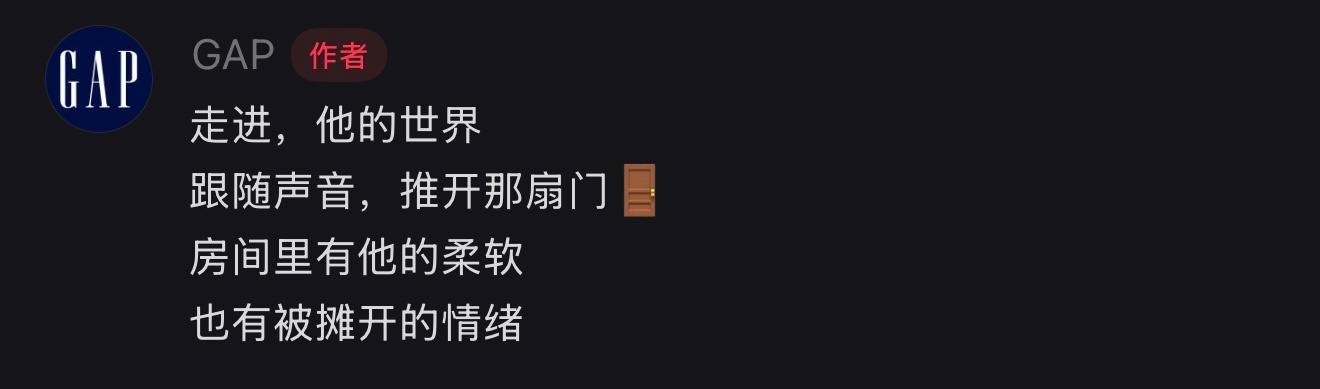 看GAP《走出这一刻》主题的文案,仿佛走进了成毅的内心,读文字,感受他的故事“我们都在寻找敢于停下的地方,一次深呼吸的机会,找到属于自己的安心空间,摊开情绪,将心事递出,片刻停靠,找回自己的节奏,停靠后,他选择走出来的那一刻,是你熟悉的那个他,也会是你没见过的他。停留,并不意味退让,当节奏开始回响,他推开那扇门,走入人群,走向爱与期待,也走近那个更清晰的自己,不喧哗,却更有力量不张扬,却步步回响”难怪在帝舵直播的时候,哥提到冥想,提到抉择,他选择走出来的那一刻,已经找回了自己的节奏,明确了自己的方向