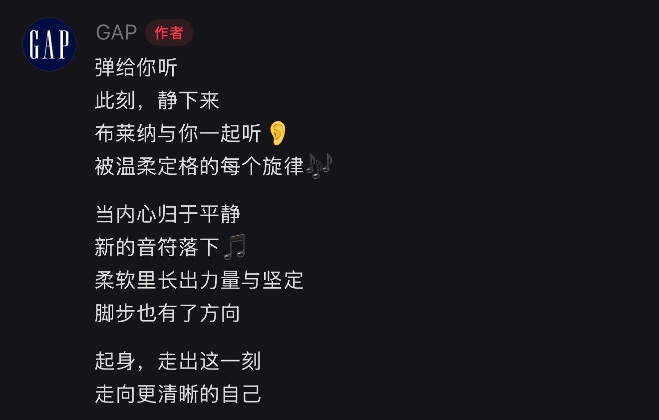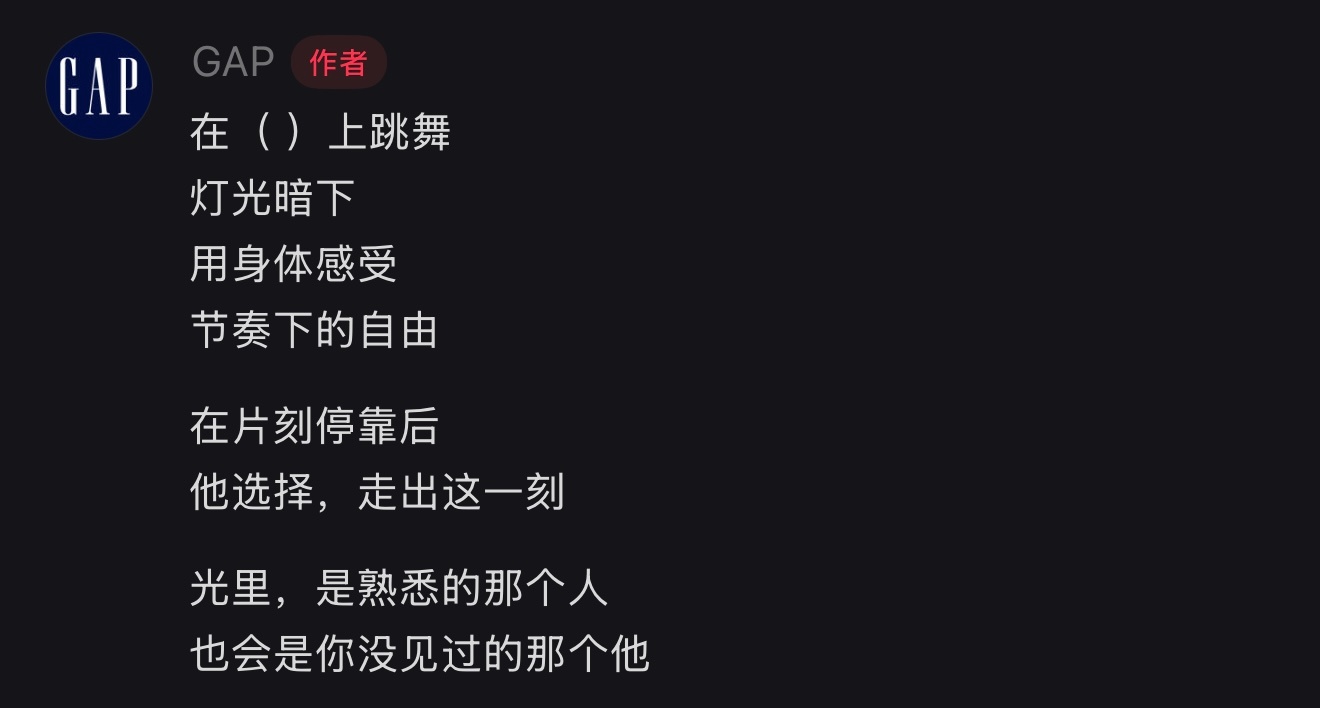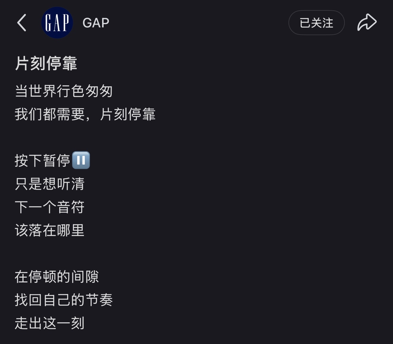 看GAP《走出这一刻》主题的文案,仿佛走进了成毅的内心,读文字,感受他的故事“我们都在寻找敢于停下的地方,一次深呼吸的机会,找到属于自己的安心空间,摊开情绪,将心事递出,片刻停靠,找回自己的节奏,停靠后,他选择走出来的那一刻,是你熟悉的那个他,也会是你没见过的他。停留,并不意味退让,当节奏开始回响,他推开那扇门,走入人群,走向爱与期待,也走近那个更清晰的自己,不喧哗,却更有力量不张扬,却步步回响”难怪在帝舵直播的时候,哥提到冥想,提到抉择,他选择走出来的那一刻,已经找回了自己的节奏,明确了自己的方向
