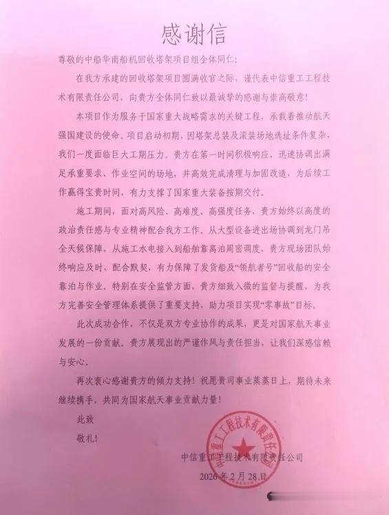 【中船华南船机顺利完成“领航者号”网系回收系统关键任务】近日,中船华南船机收到中信重工工程技术有限责任公司发来的感谢信,信中对公司在回收塔架项目中的高效协同与专业保障给予高度评价。该项目的圆满收官,标志着公司在大型装备总装、资源统筹及复杂工程项目协同管理方面的综合能力再上新台阶。