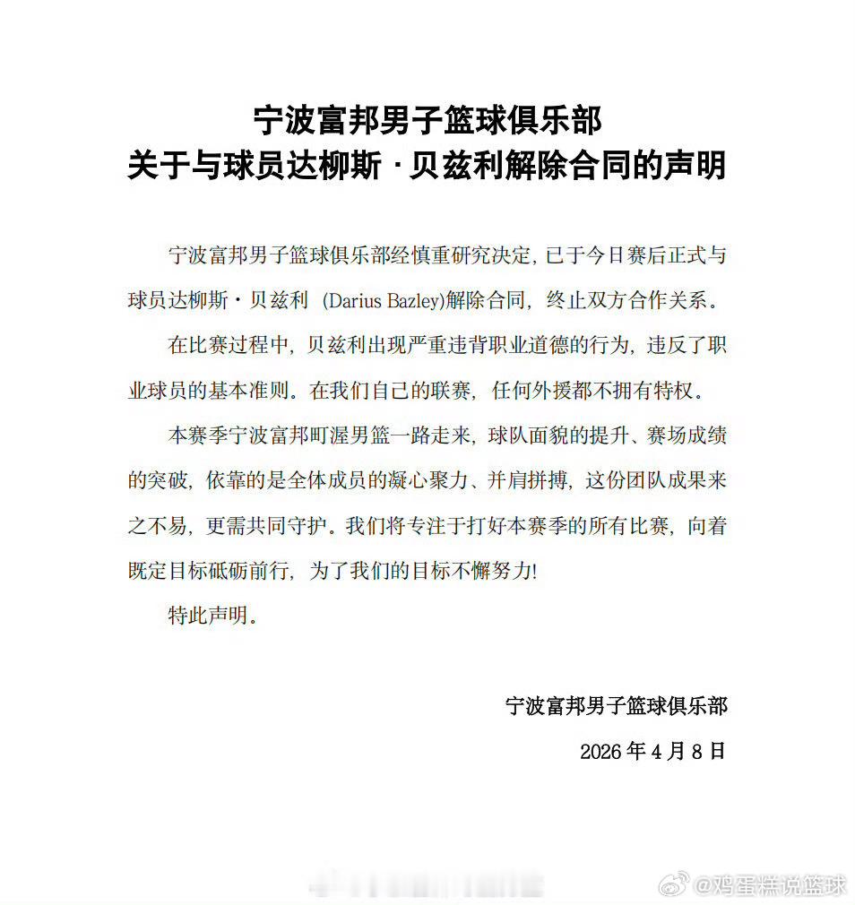 CBA球队内讧再现?但宁波队的处理速度很快,他们不仅光速与贝兹利解约,还正式发出