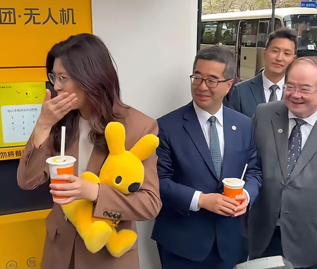 郑丽文喝奶茶的场面太温馨了。她直呼美团无人机送来的奶茶“热的,好喝”,还说要把美团带回台湾,送来的奶茶居然还是台湾老品牌coco,她开玩笑地把肖副手中的奶茶抢过来说“都是我的”,大家都开心地笑了。美团老总也是亲自陪同。