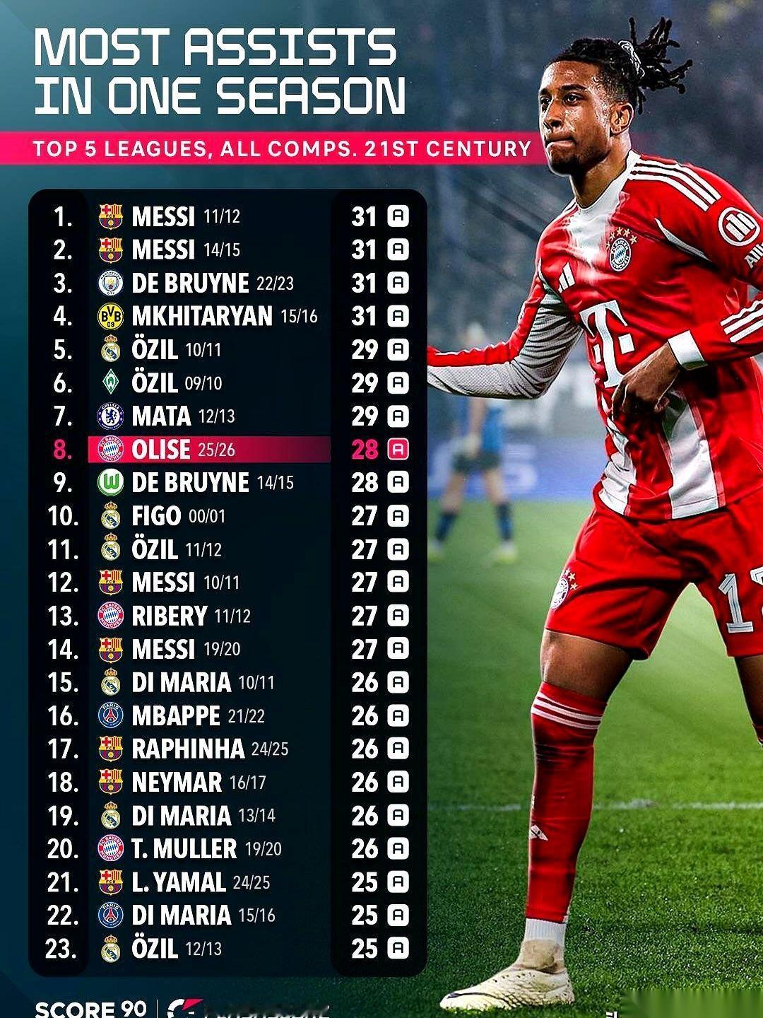 现在的奥利塞有多离谱?看看这组数字。他本赛季代表拜仁踢了40场球,已经刷出了28次助攻。