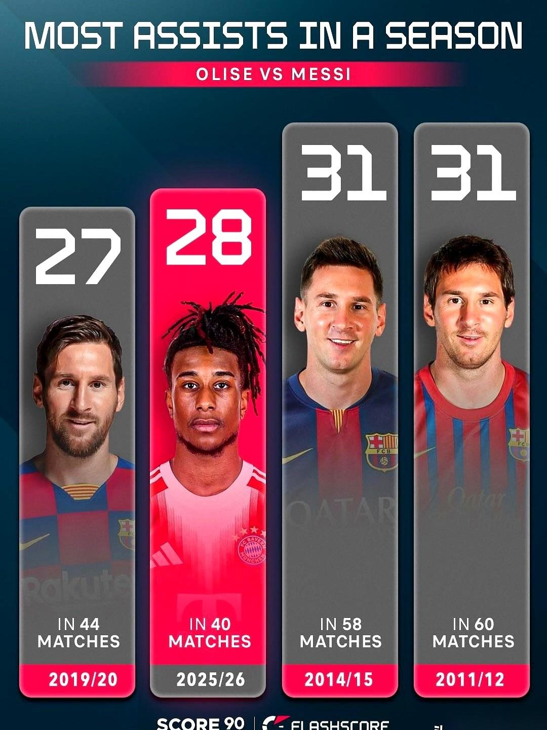 5300万欧元买来的奥利塞,正要把梅西压在箱底的历史纪录给掀了。