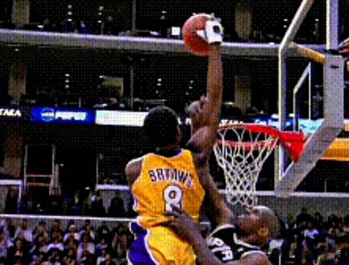 当时科比在比赛中三步起跳,他无视马刺队的防守直接扣篮,这个时候科比的嘴都和篮筐平齐了,他的肩膀基本和篮板平齐。