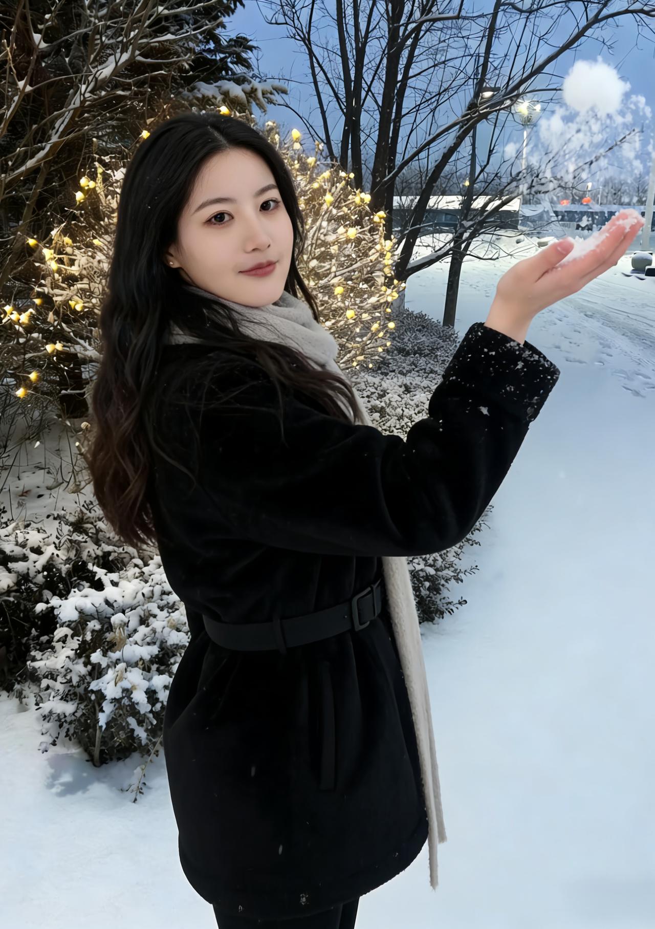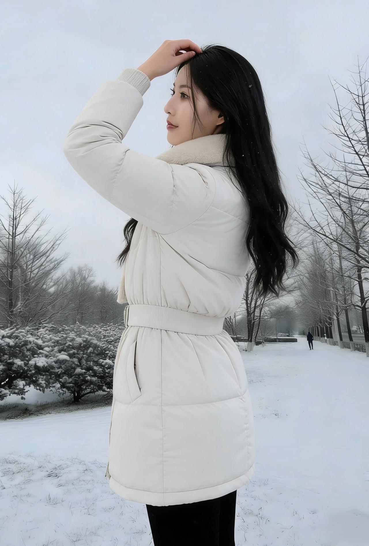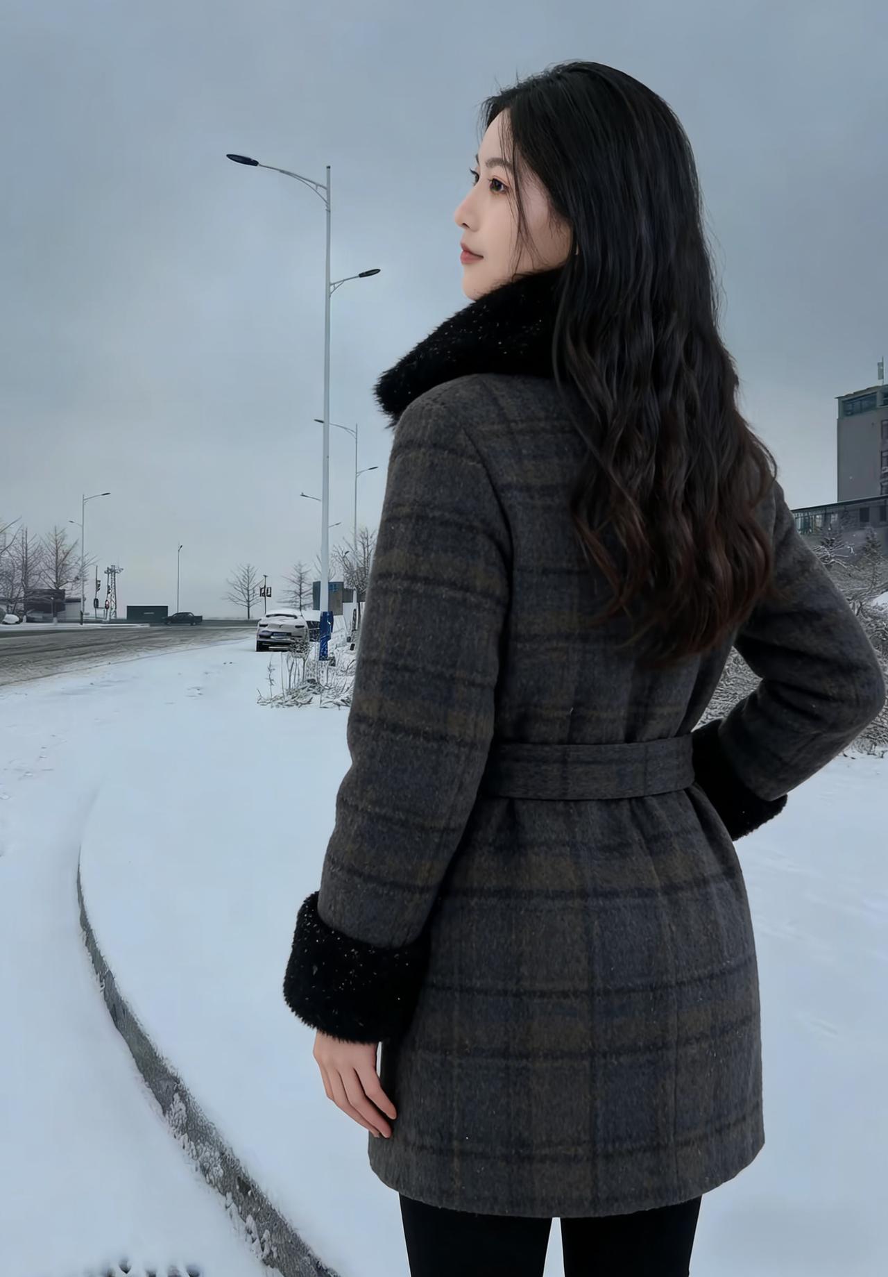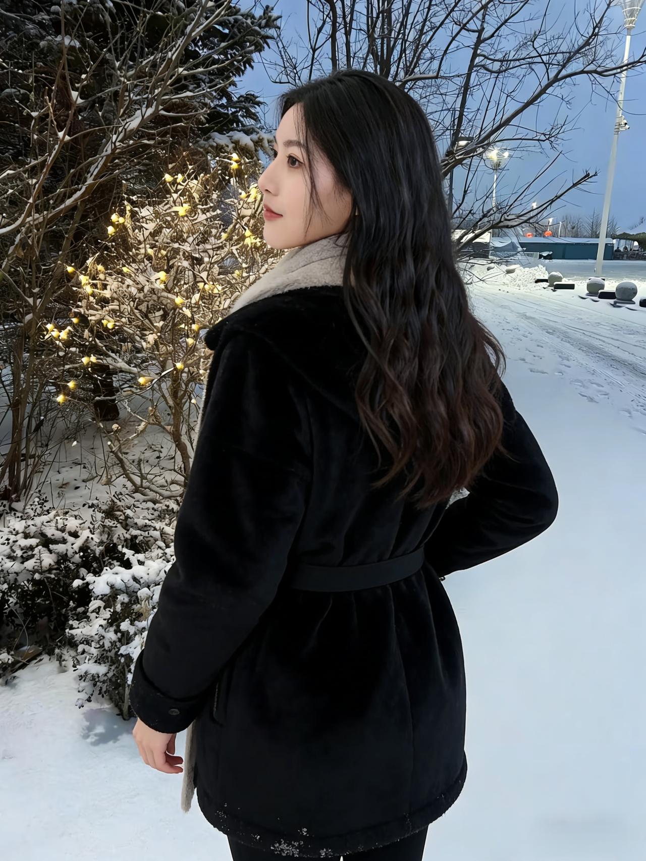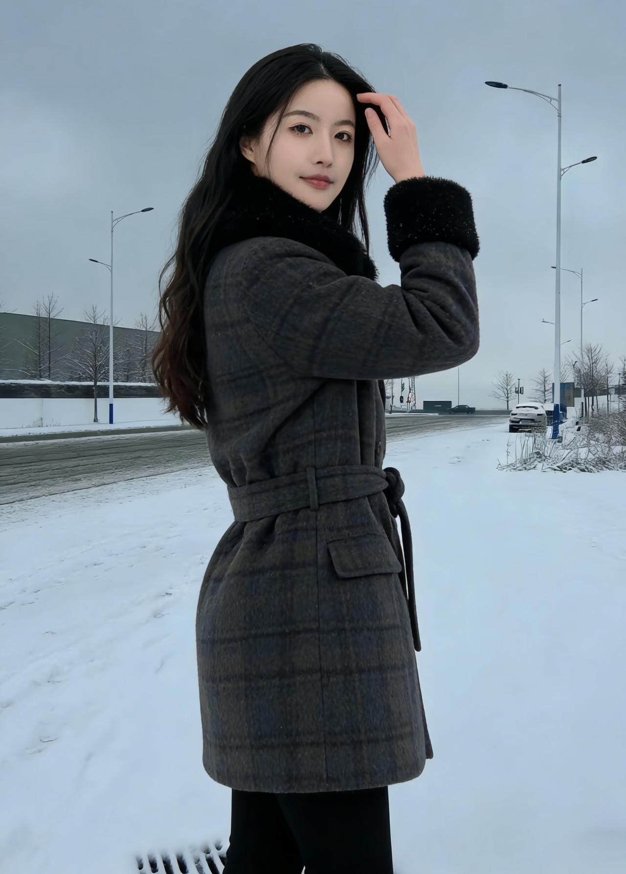 她的背影是雪的另一种形状 毛领翻起,像把云披在肩上 束腰的带子勒出腰线 让风也有