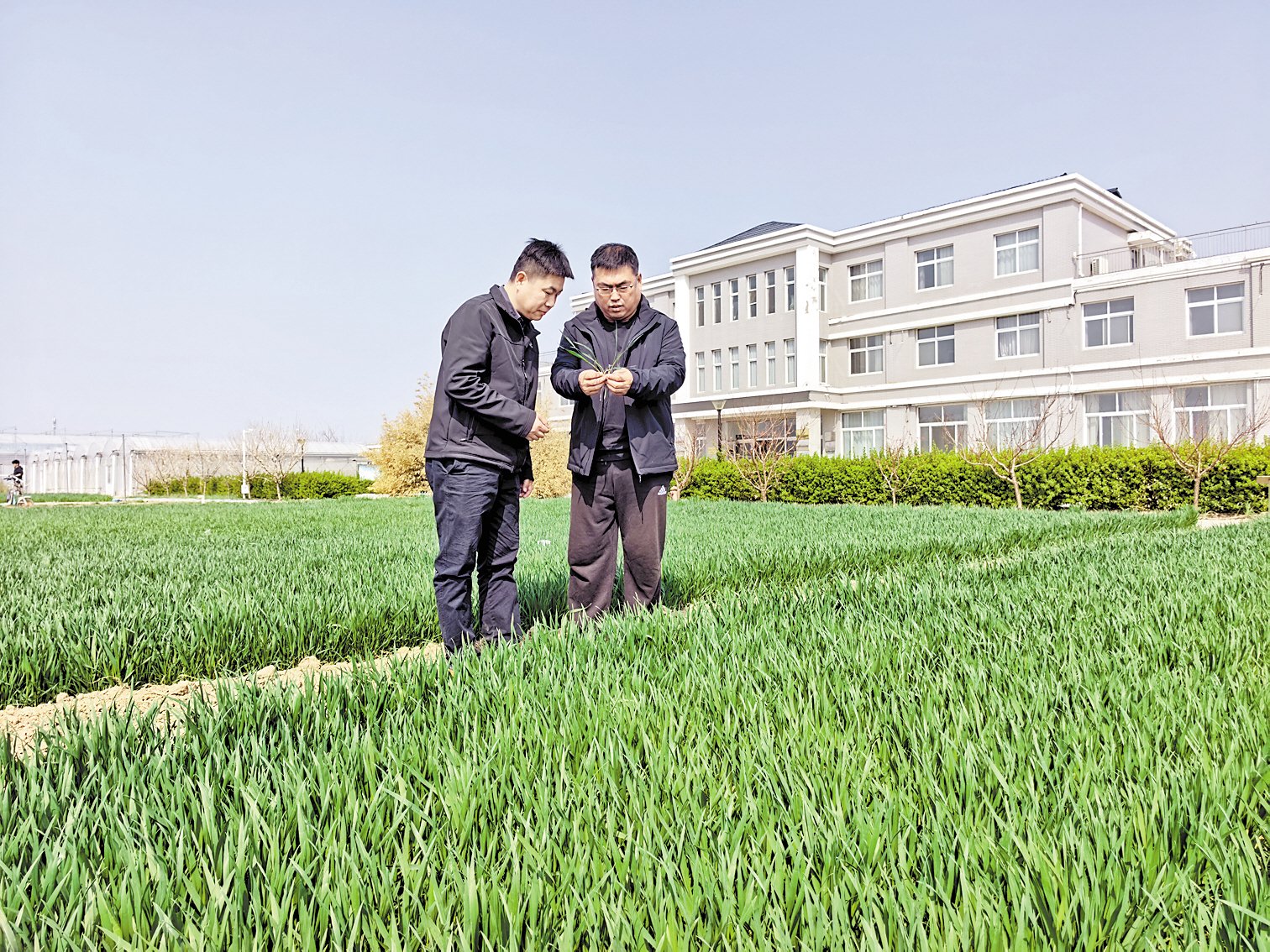 4月2日,中国科学院南皮生态农业试验站的试验田里,站长孙宏勇(右)查看小麦长势。本报记者郝东伟摄