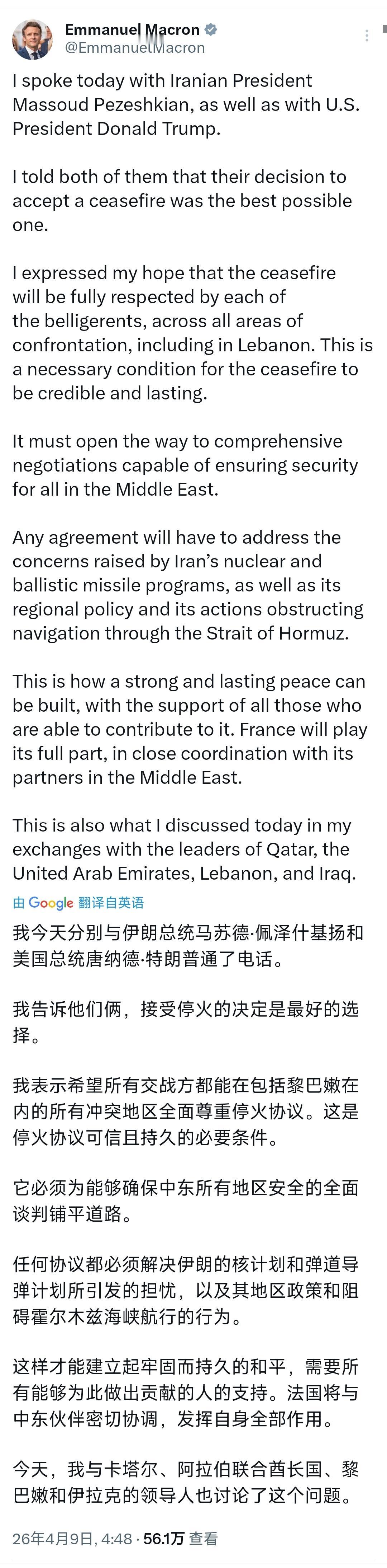 法国总统马克龙今天(北京时间4月9日)写道;“我今天分别与伊朗总统马苏德·佩泽什基扬和美国总统唐纳德。特朗普通了电话。我告诉他们俩,接受停火的决定是最好的选择。