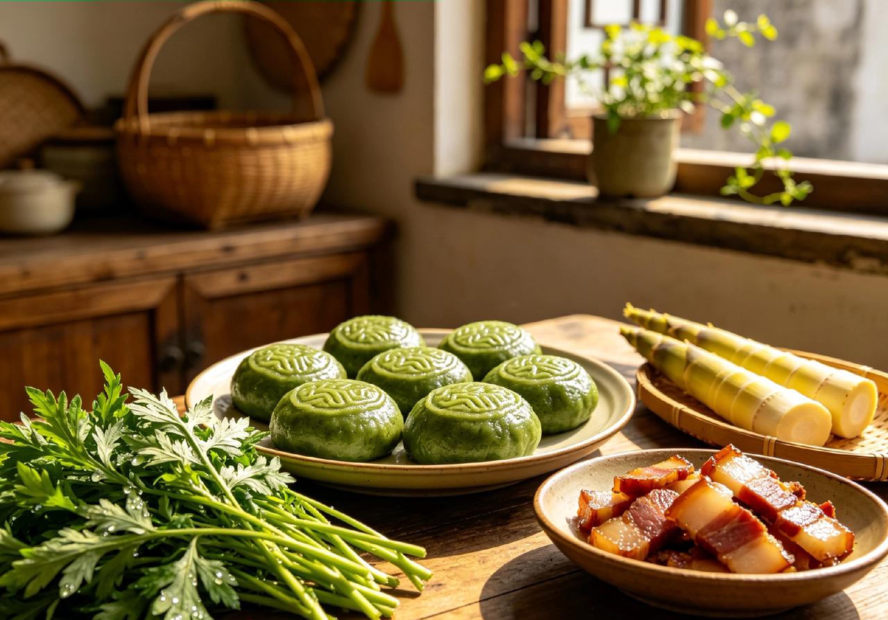 清明前后,家家户户都要做清明果。鲜嫩艾草焯水捣泥,与糯米粉揉成翠绿面团,包裹春笋、腊肉、香干等时令馅料,捏出精致花边,上锅蒸透,满屋都是草木清香。