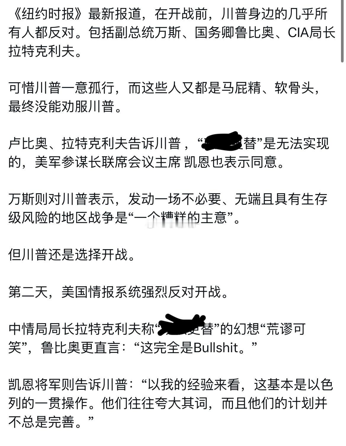 根据《纽约时报》4月7日最新报道(基于即将出版的书《Regime Change》),文章详细披露了特朗普在2月多次战情室会议中,无视万斯、鲁比奥、拉特克利夫和凯恩等顾问反对“更替”的意见,最终决定与以色列联合打击伊朗领导层和军方。报道引述了类似引言,如鲁比奥称其“bullshit”,万斯虽反对但表示支持。