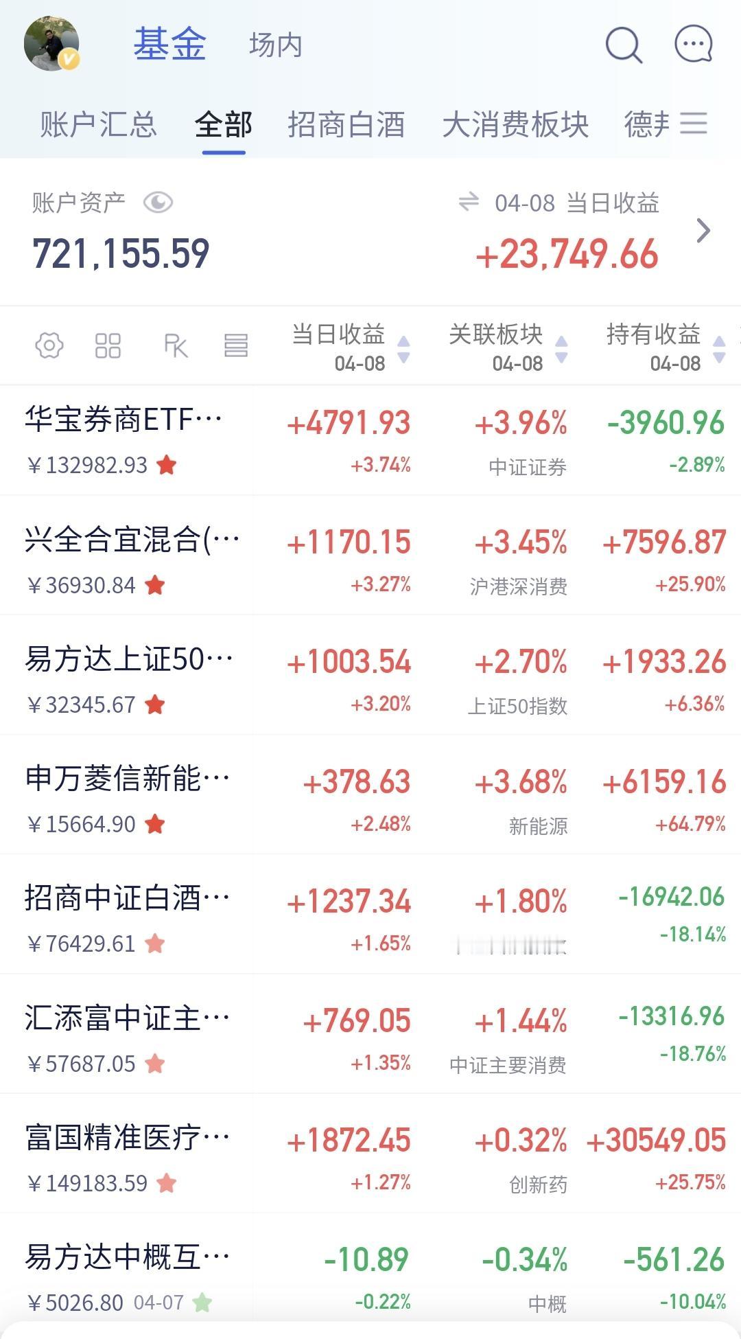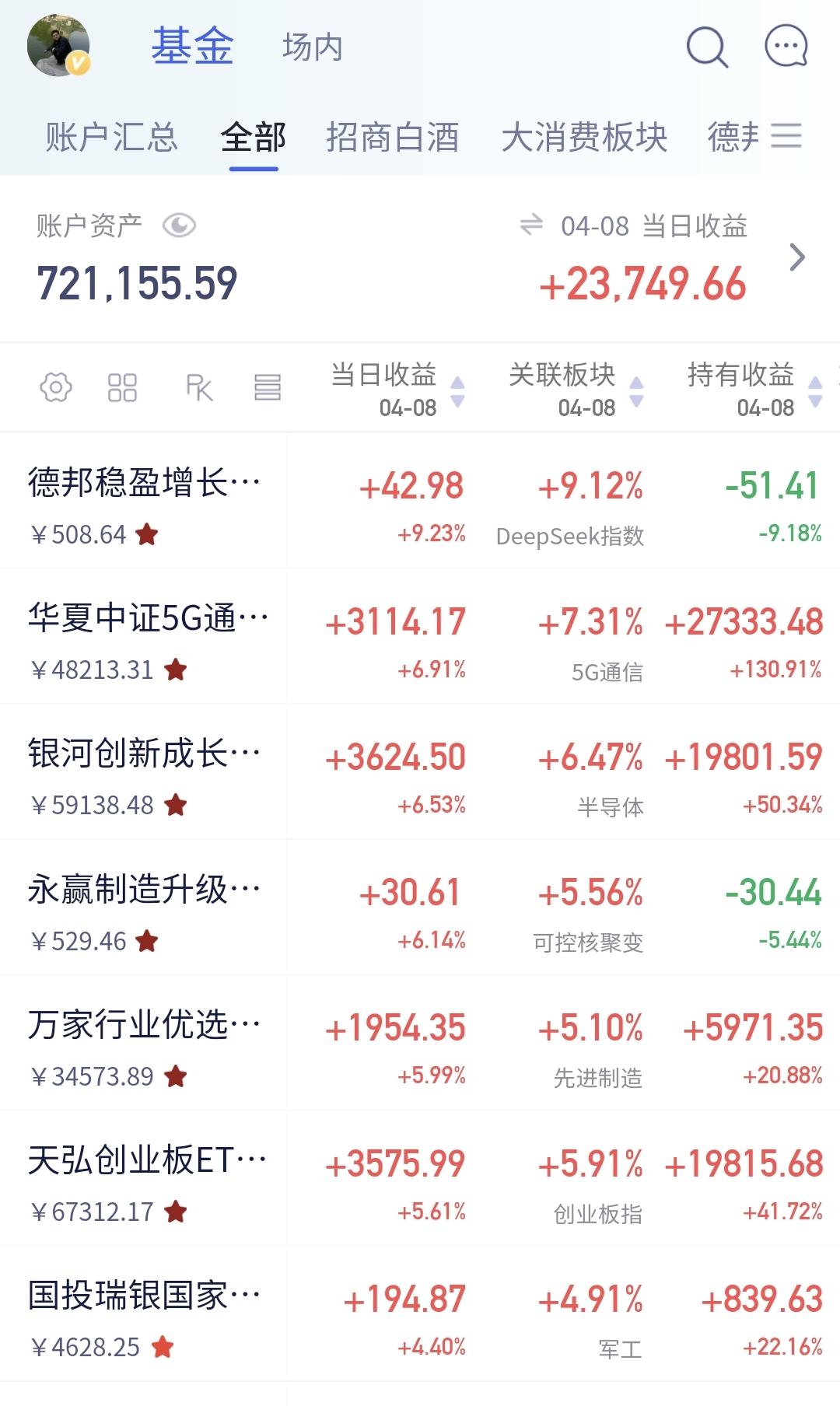 持有的基金中,昨天晚上净值更新以后全部都是上涨,上涨幅度最大的三个板块是:AI应用板块,5G板块,芯片半导体板块,上涨幅度最小的三个板块是:创新药板块,大消费板块,白酒板块。