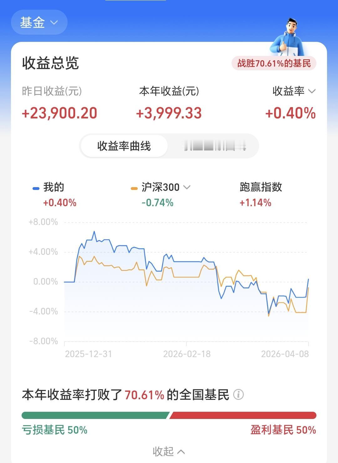 今年以来收益3999元,收益率0.40%,跑赢了全国70.61%的基民,也跑赢了沪深300指数0.74%的下跌幅度。