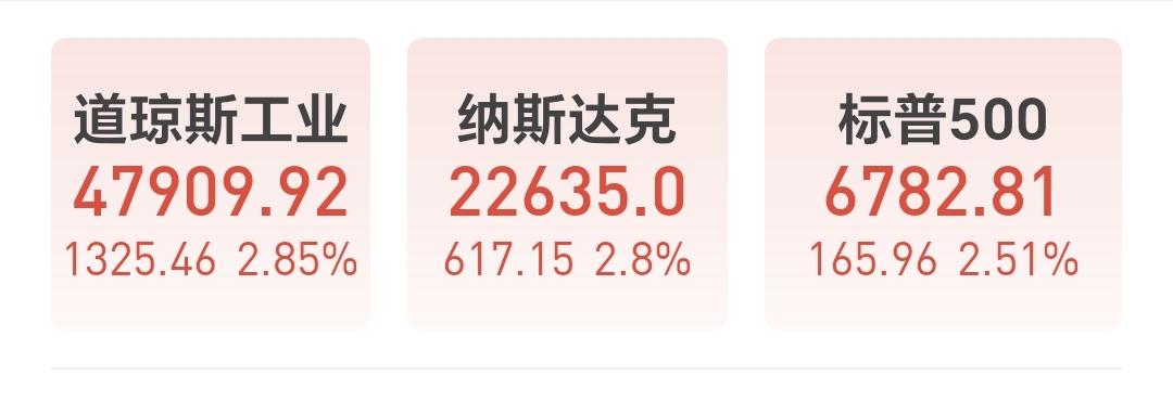 美股市场昨天晚上也是上涨,道琼斯指数上涨了2.85%,纳斯达克指数上涨了2.8%,标普指数上涨了2.51%,上涨幅度都在2%以上。