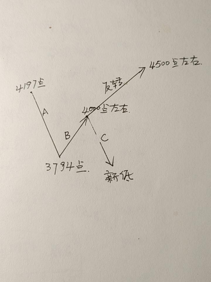 昨天收盘点位3995点,中等反弹强度的压力位置是3996点,相差了一个点可以忽略不计,今天观察强大的压力位置4043点,如果能够突破并站稳这个点位,反转就是大概率的事情,今年的4500点左右可期,如果不能突破4043点,这里就有B浪反弹的可能性,B浪反弹结束以后,应该就是C浪下跌。