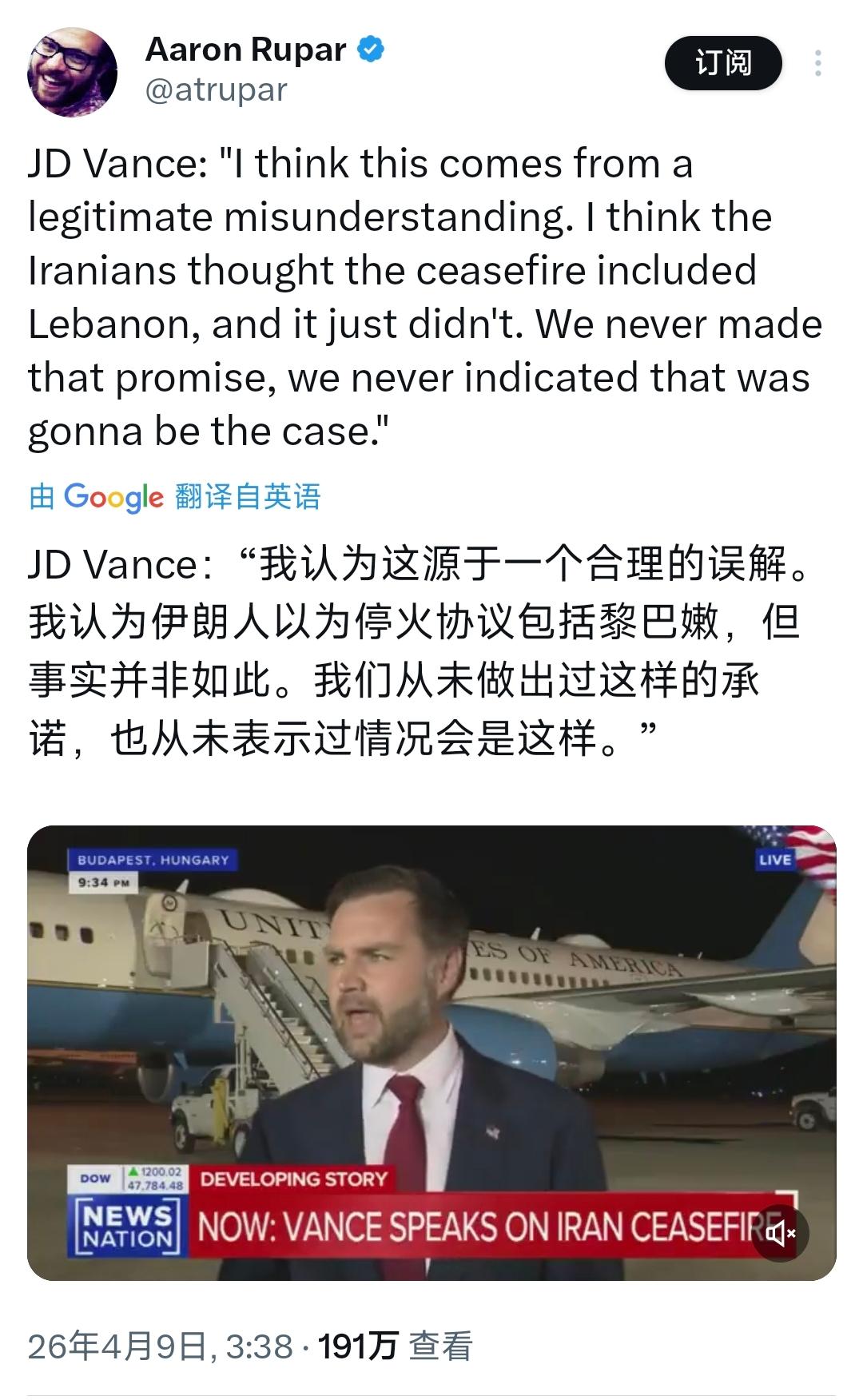 美国副总统JD万斯今天(北京时间4月9日)接受采访时否认停火包括黎巴嫩。万斯表示:“我认为这源于一个合理的误解。我认为伊朗人以为停火协议包括黎巴嫩,但事实并非如此。我们从未做出过这样的承诺,也从未表示过情况会是这样。”