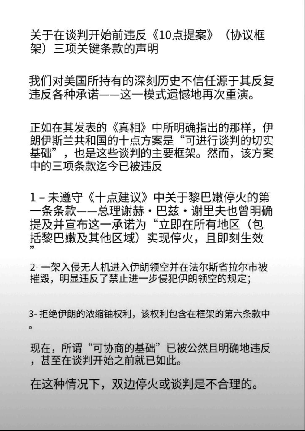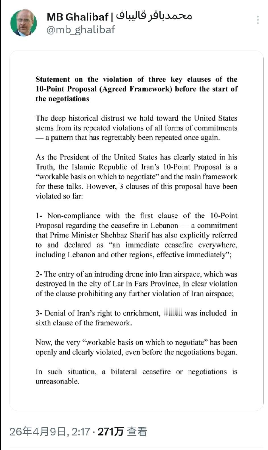 北京时间2026年4月9日,伊朗议会议长卡利巴夫发文:“关于在谈判开始前违反10点提案框架协议三项关键条约的声明……”