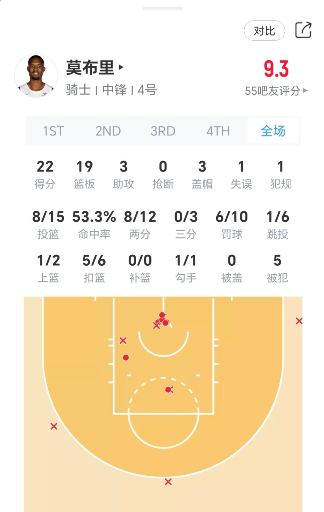 莫布里今日表现:出战35分39秒,投篮15中8,三分3中0,罚球10中6,得到2