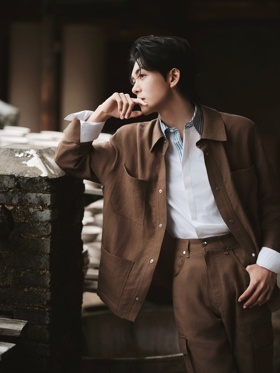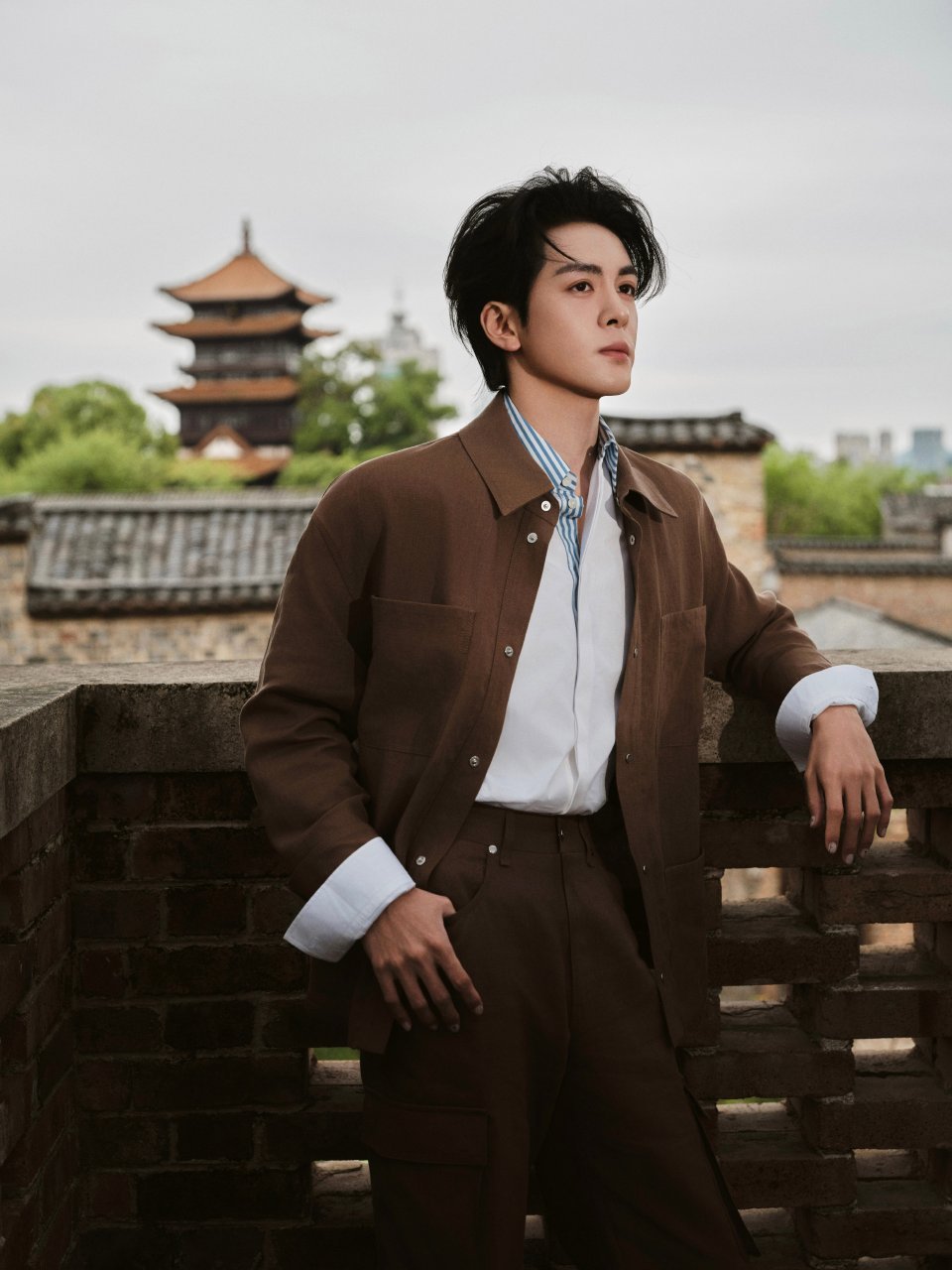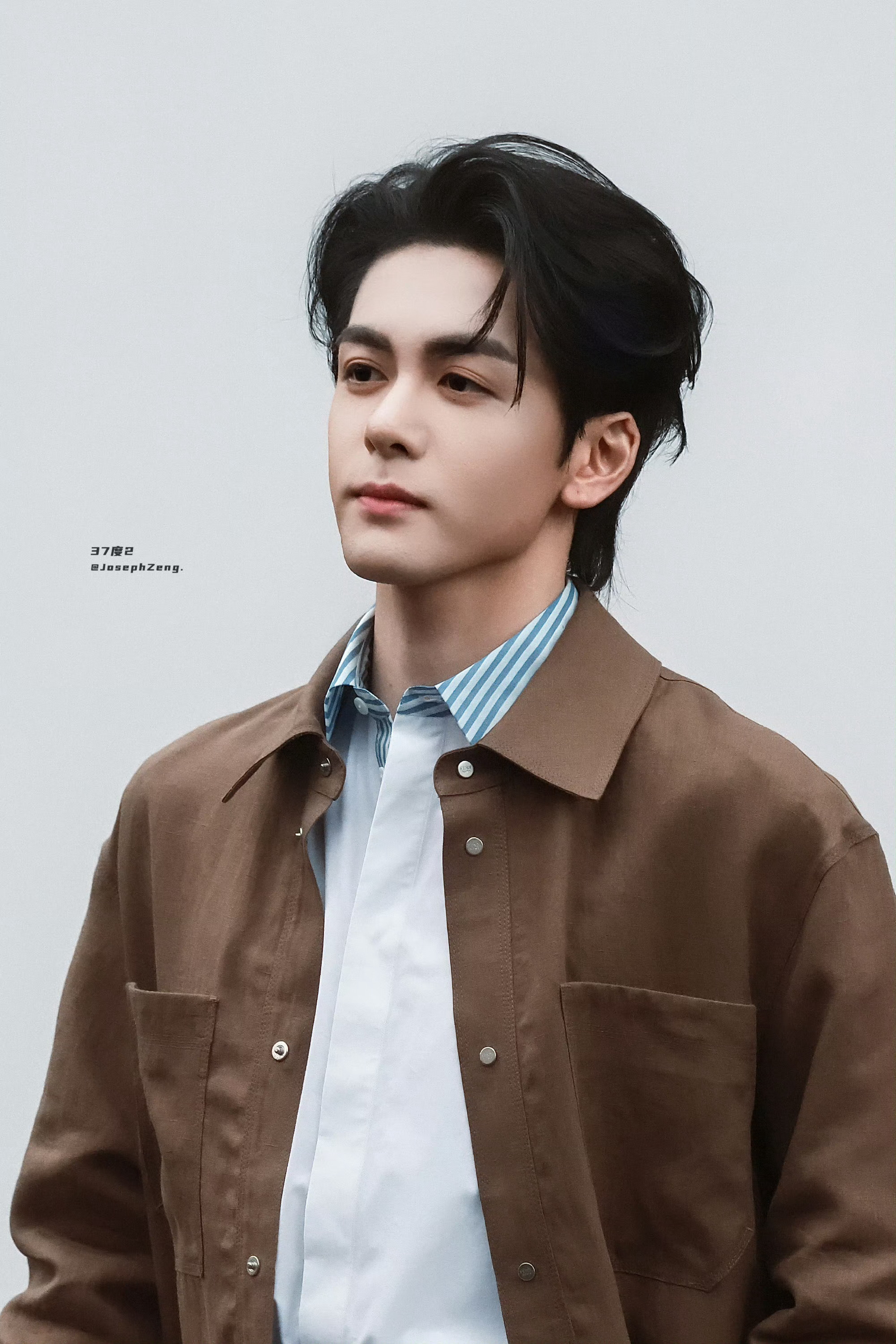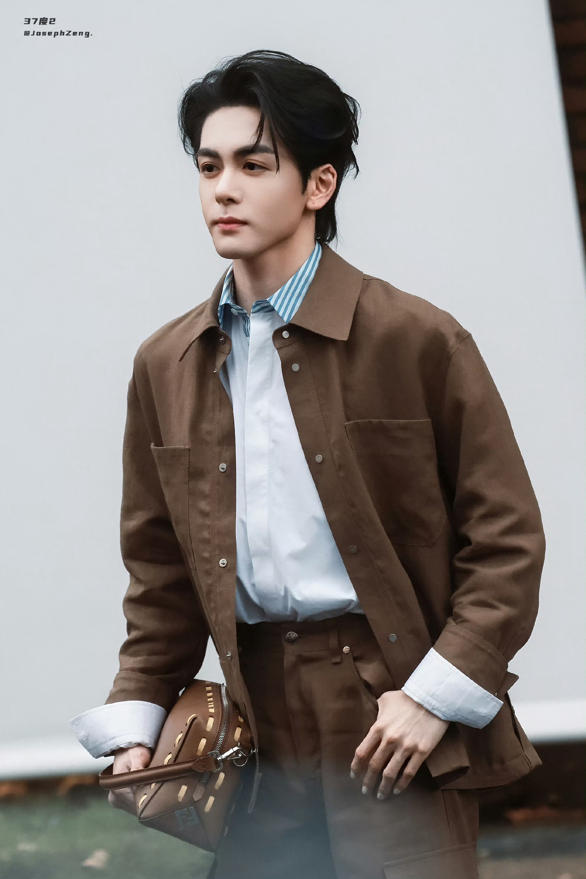 曾舜晞轻点帅曾舜晞周正的中式帅哥曾舜晞焦糖色工装利落沉稳,蓝白条纹添清爽。青砖黛
